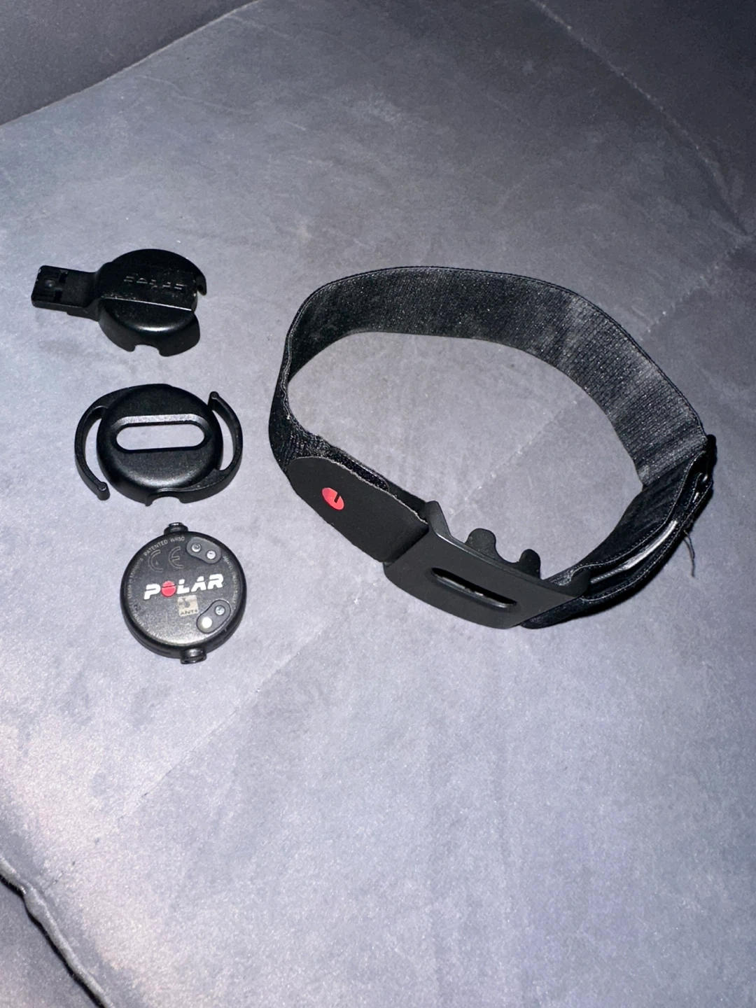 This is a Polar Verity Sense heart rate monitor in black. It comes with the main sensor unit, a strap, and two clips. I used to track my swimming and jiujitsu sessions. It’s perfect for tracking bike rides, outdoor runs, and gym sessions.