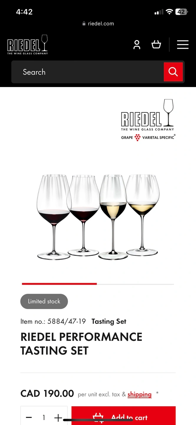 This Tasting Set contains four glasses from the RIEDEL Performance series: one Cabernet, one Pinot Noir, one Sauvignon Blanc and one Chardonnay.