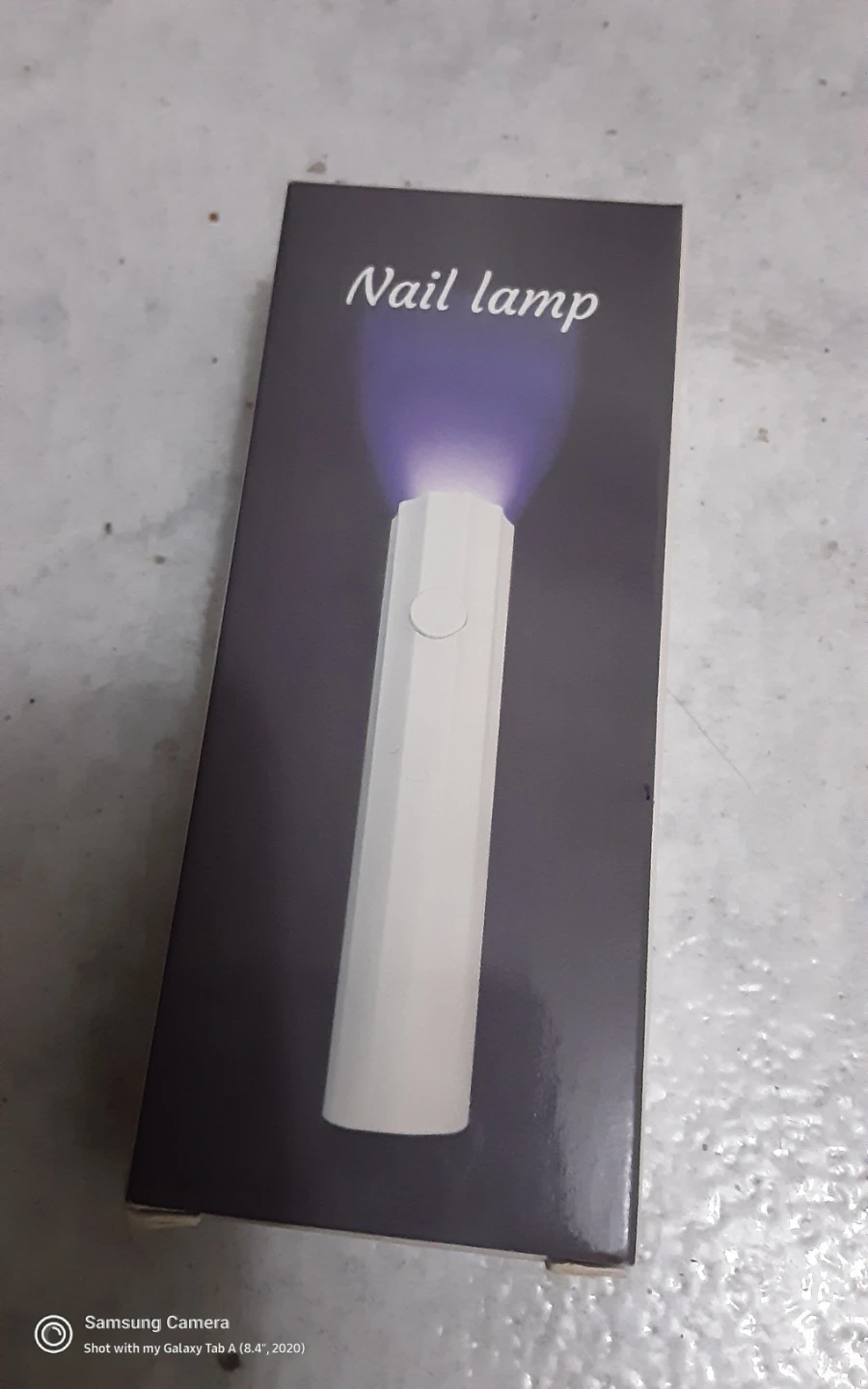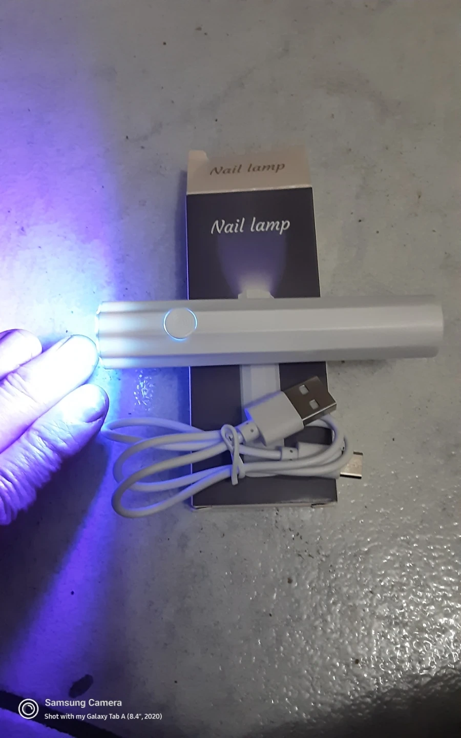 This is a portable UV nail lamp. It's a handy device for curing nail polish. Comes with a USB charging cable.