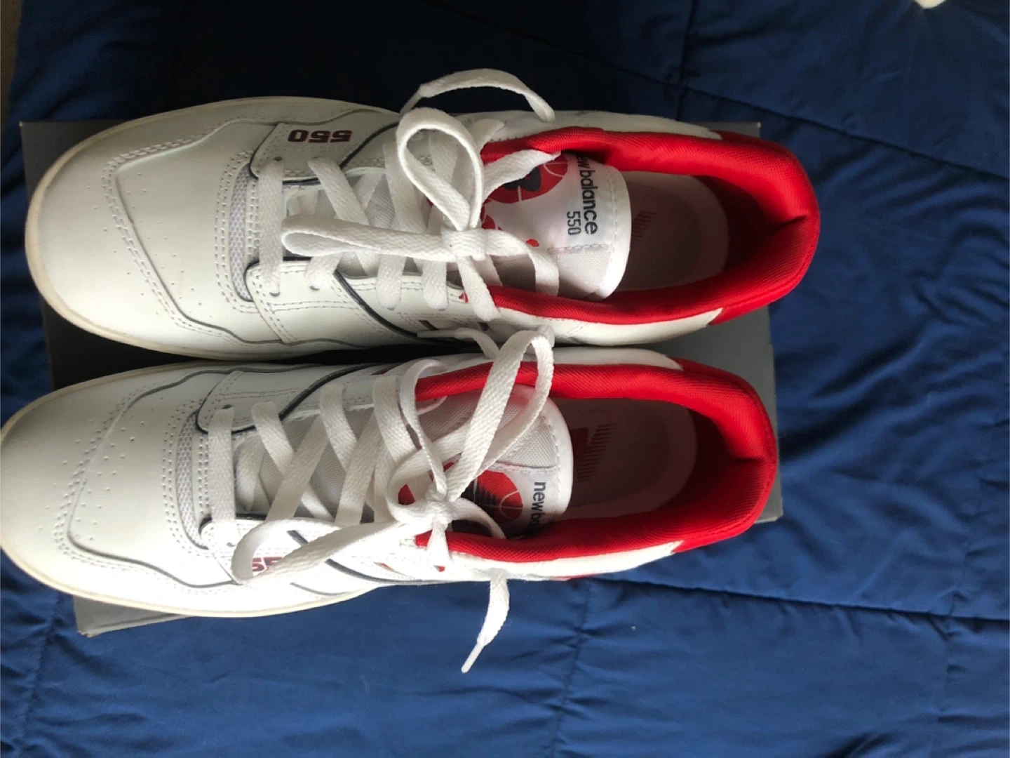 These New Balance 550 sneakers are white with red accents. They come in their original box. Classic basketball-inspired design! Size 9 men’s