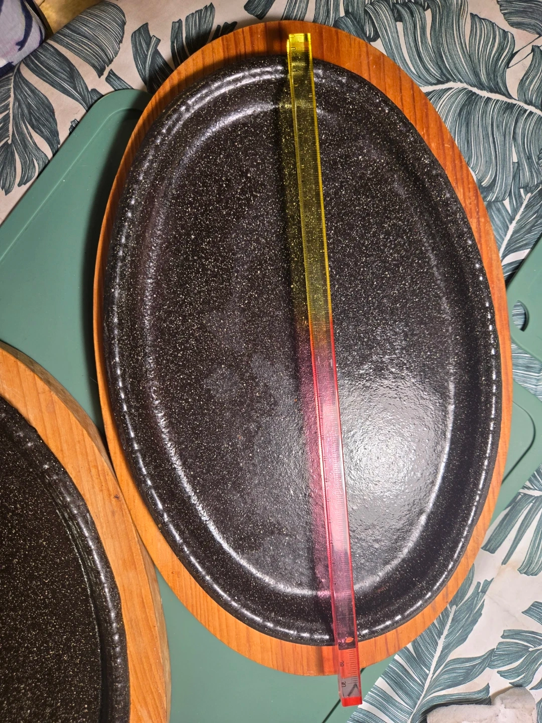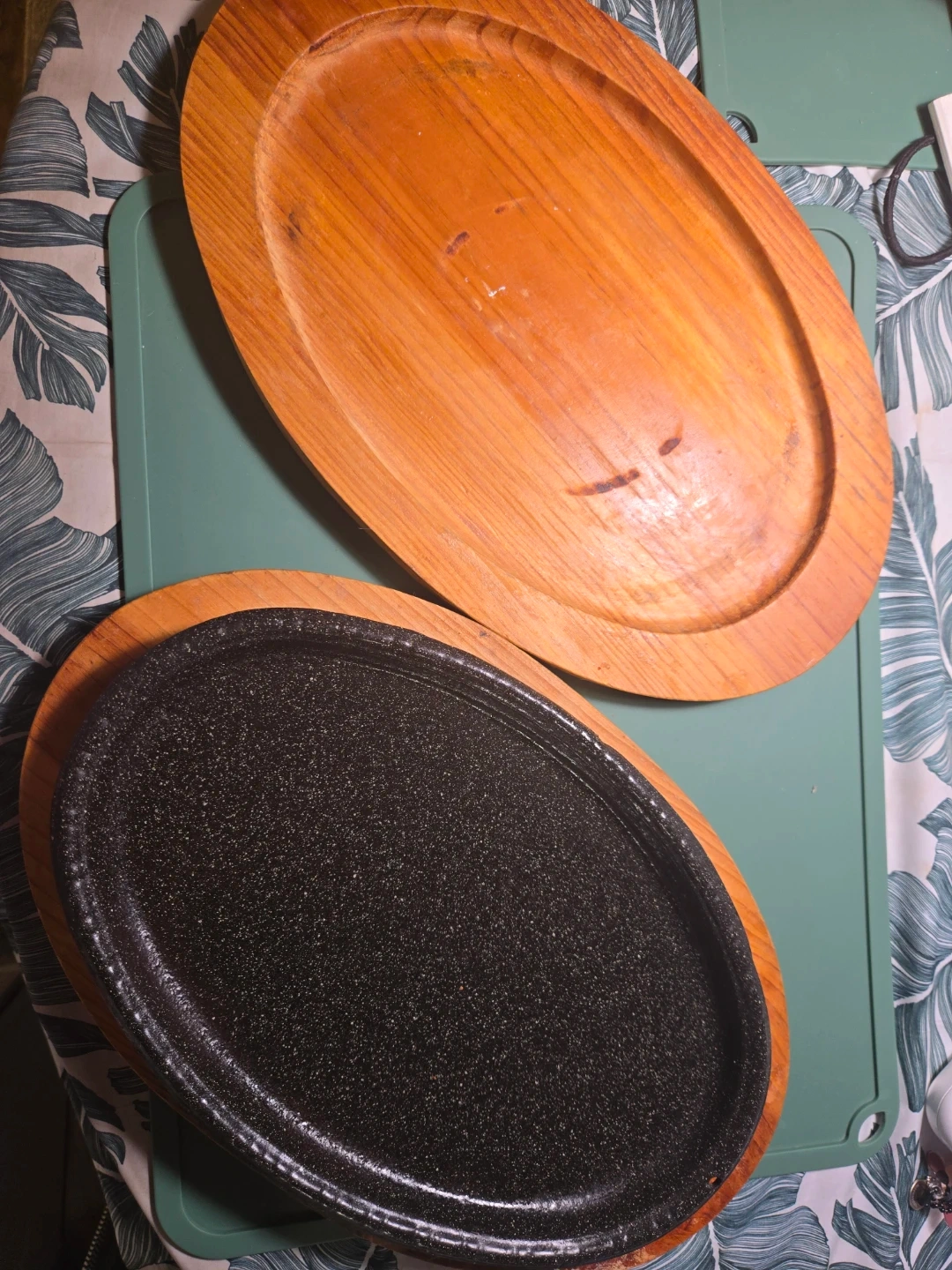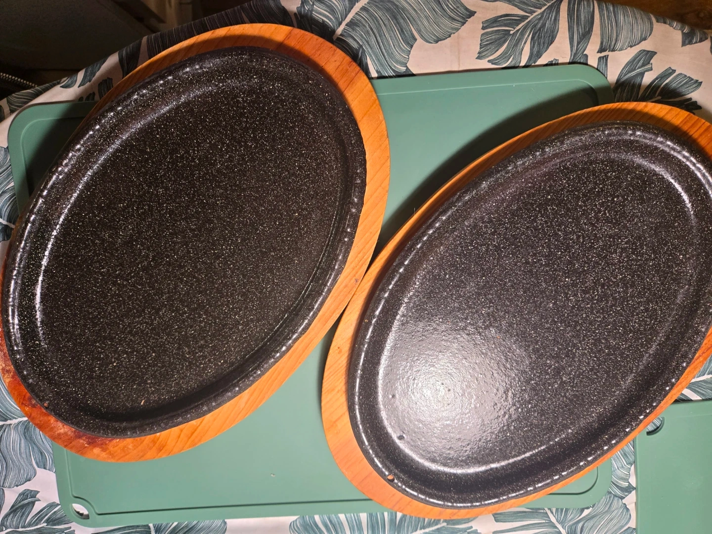 Set of 2 Cast Iron Sizzling Platters with Wooden Bases