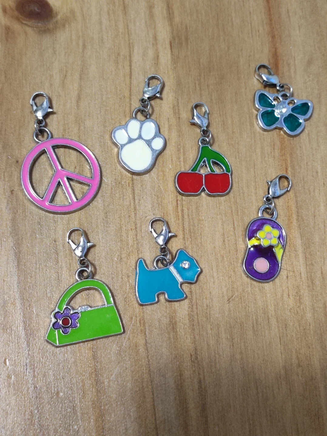 This is a fun set of six enamel charms. It includes a peace sign, paw print, cherries, butterfly, handbag, and a dog. They're perfect for adding a personal touch to bracelets or necklaces! 2$ for each or 10$ for all. Located in East Village Downtown