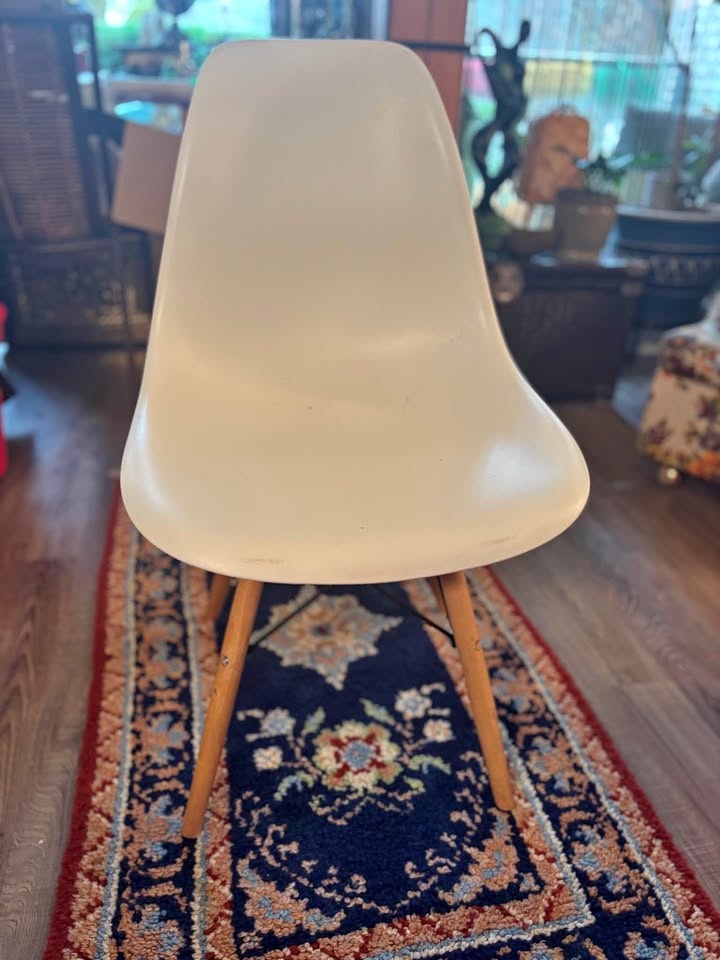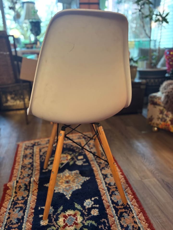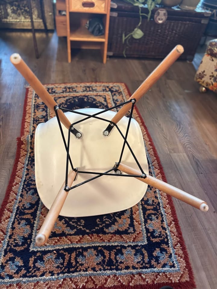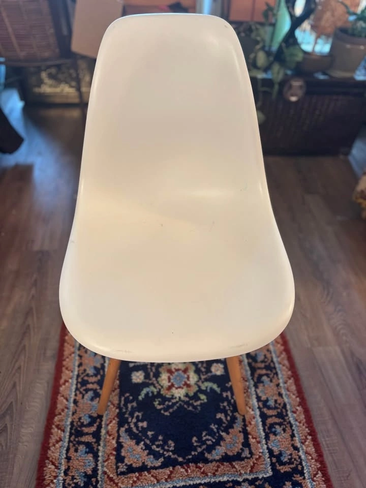 Modern IKEA molded shell chair with solid wood dowel legs and black metal support frame. Classic Scandinavian design — lightweight, minimalist, and versatile. Perfect for: Kids desk or homework station, Office desk, Dining table, Vanity, Entryway or bedroom accent. Comfortable curved seat with sturdy wooden legs. Gently used. Some light scuffs and minor surface marks on the white shell (shown in photos). Structurally solid and fully functional. Height approx: 31”, Width approx: 18”. Easy to clean and move. This is an IKEA Eames-style molded plastic chair with wooden dowel legs — commonly sold by IKEA under models like: LEIFARNE (older molded shell versions), JANINGE (similar molded style), Or an older IKEA “Eames-inspired” shell chair (they’ve rotated names over the years). Pickup only by Kensington square in north Burnaby.