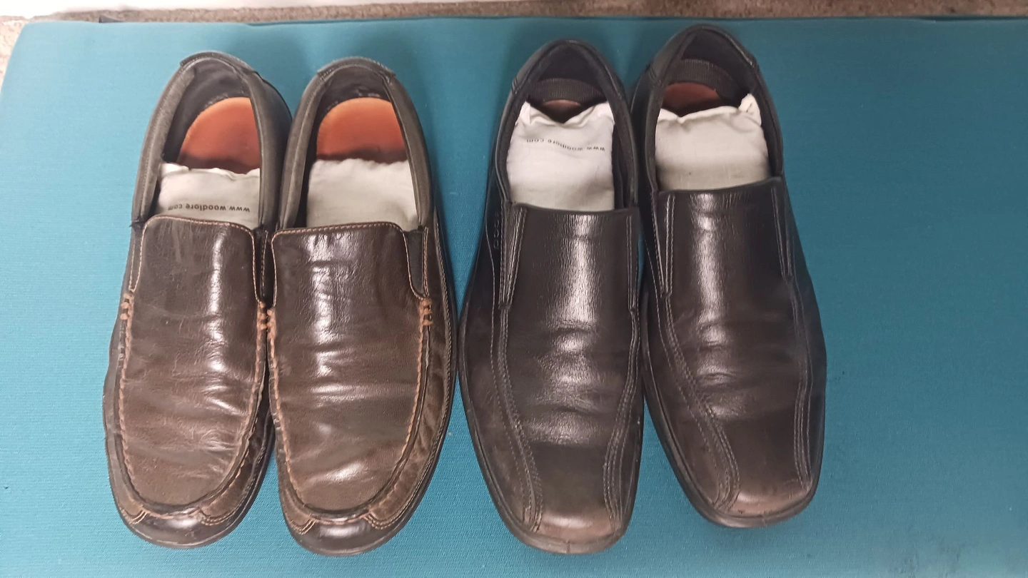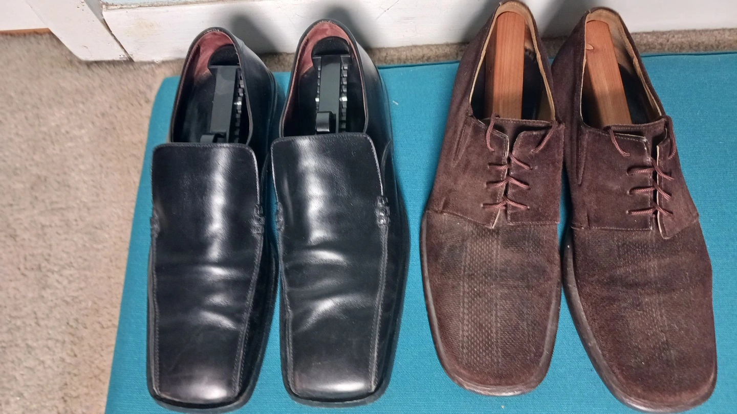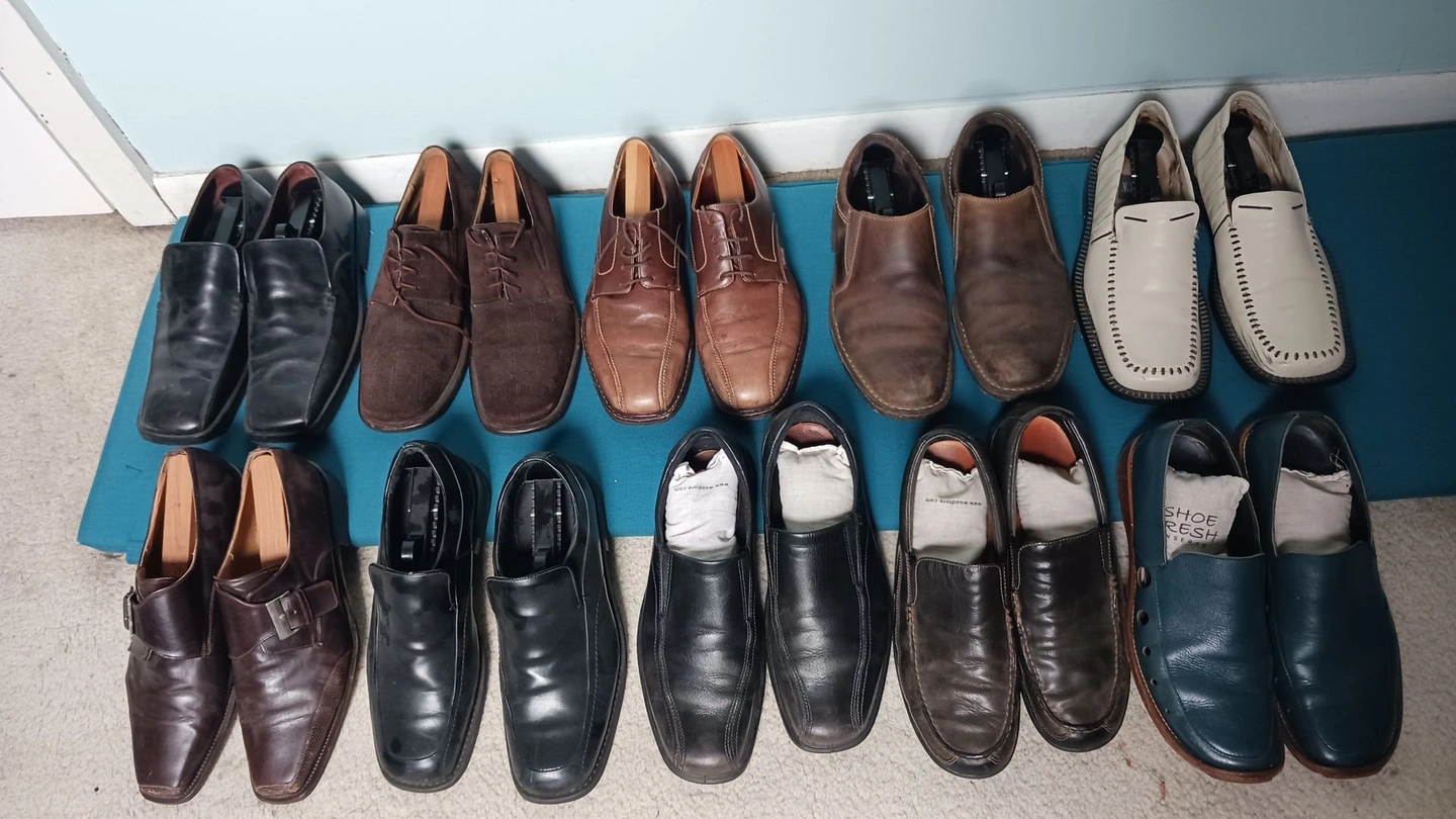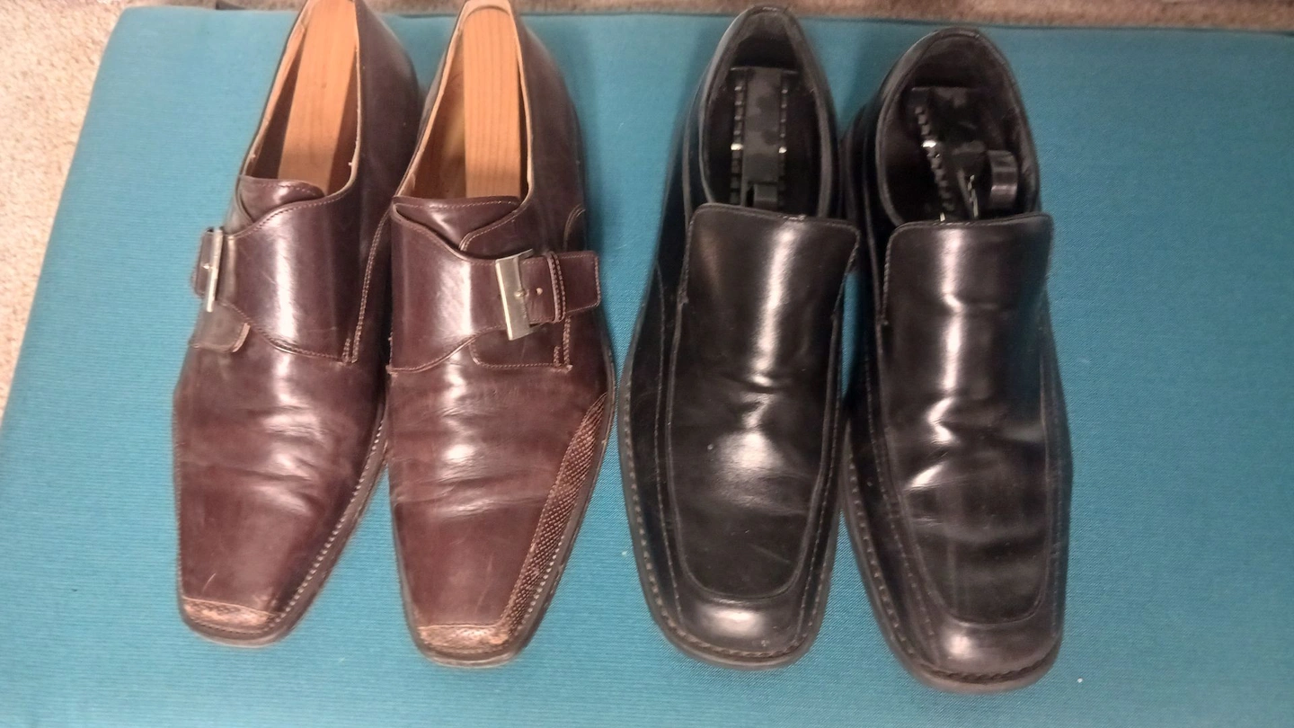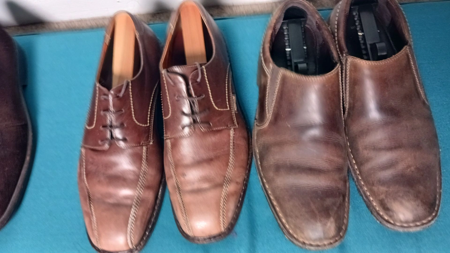 Prices range from $40 to $100. Pairs are listed in order of photos: Battaglia (x2, leather & suede), Mephisto, Johnson & Murphy (leather & nubuck), Aldo Brue, Florsheim (leather x2), Dimension-NYLA (blue, white, leather x2). Sizes are 44-45 EU / 10.5 US. All soles are newer or have been redone. Feel free to try them on before purchasing.