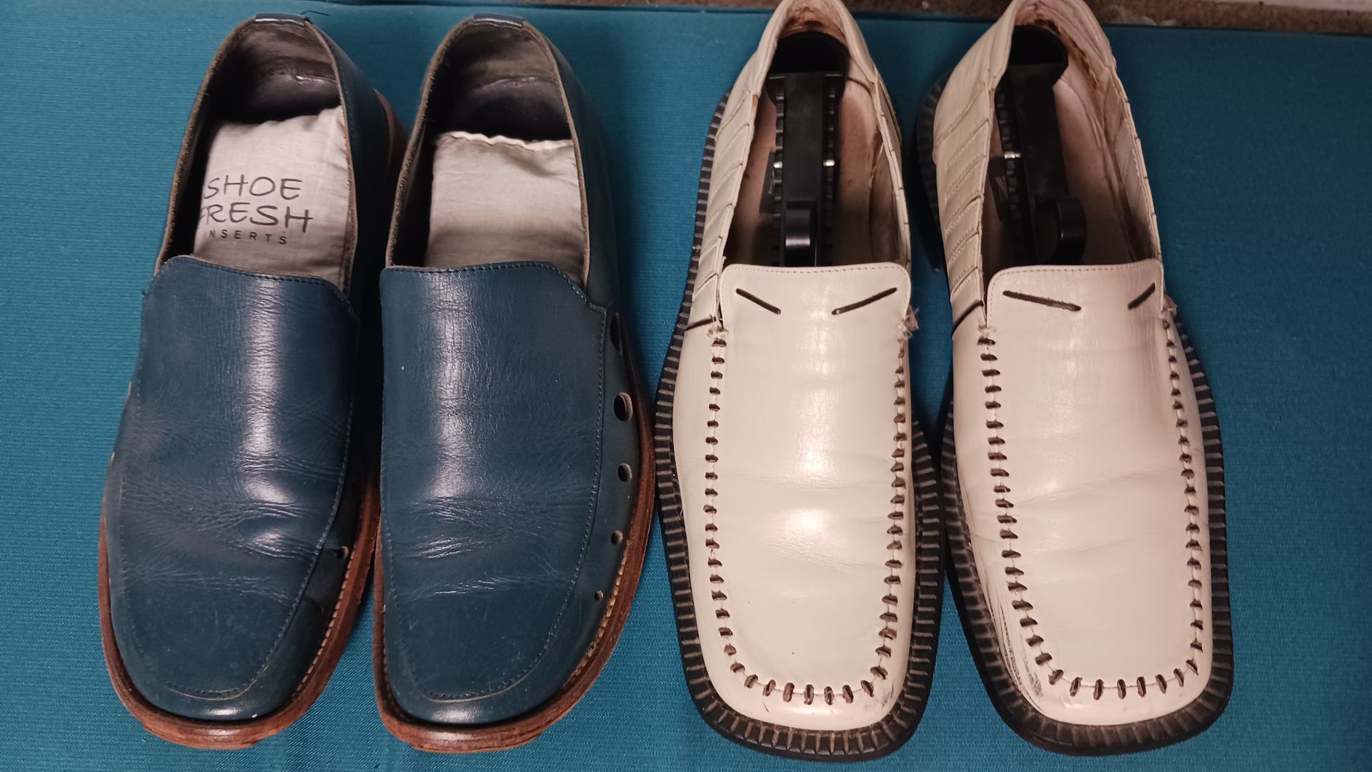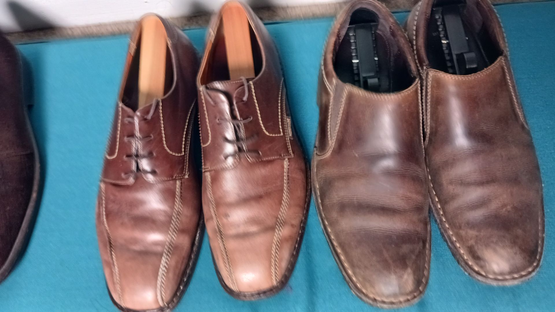 Prices range from $40 to $100. Pairs are listed in order of photos: Battaglia (x2, leather & suede), Mephisto, Johnson & Murphy (leather & nubuck), Aldo Brue, Florsheim (leather x2), Dimension-NYLA (blue, white, leather x2). Sizes are 44-45 EU / 10.5 US. All soles are newer or have been redone. Feel free to try them on before purchasing.