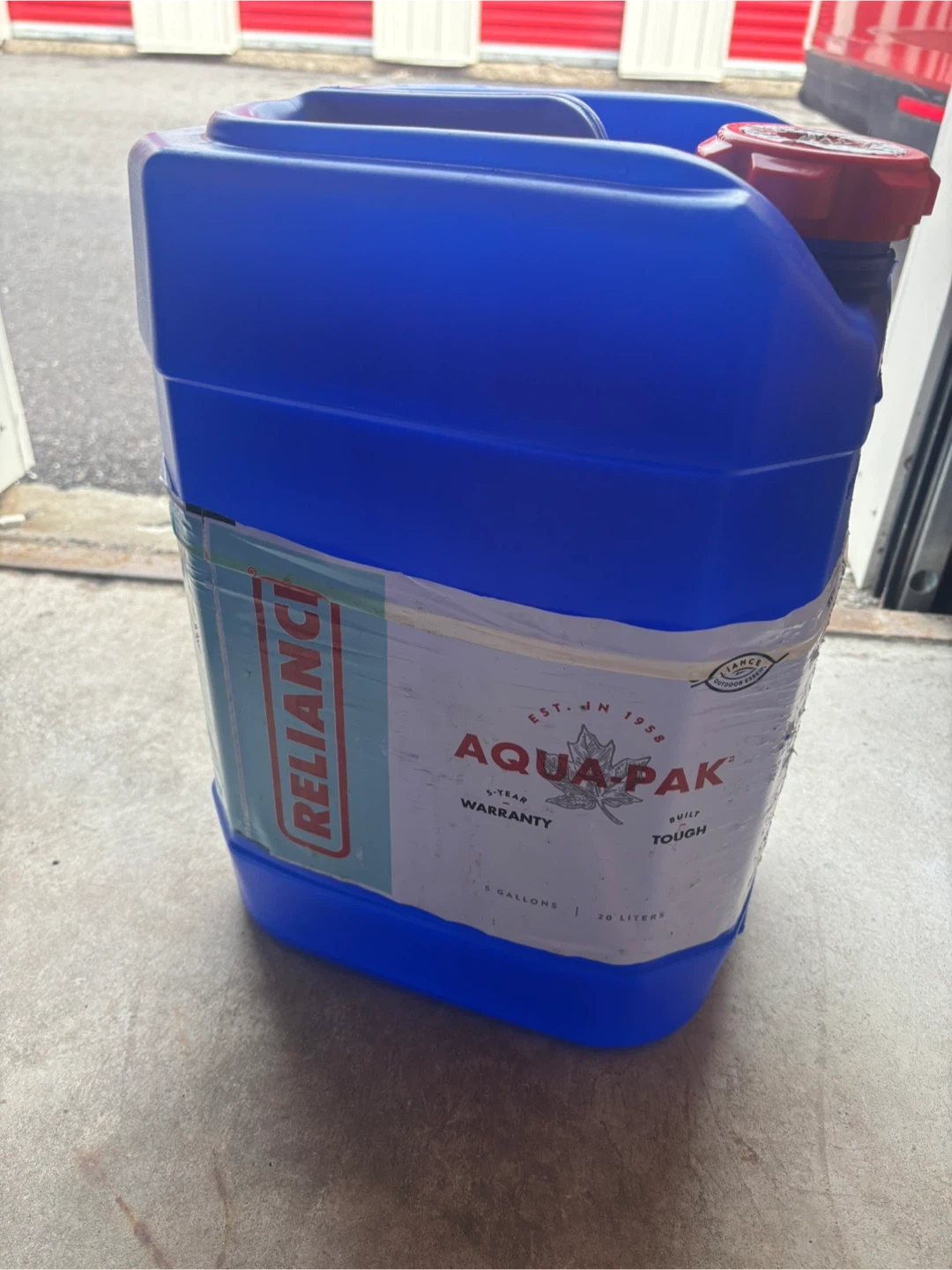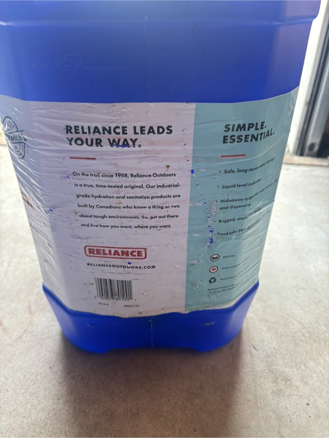 Reliance Outdoors Aqua-Pak 5-gallon water container. It's a BPA-free, liquid level indicator jug for long-term water storage. Rugged, stackable, and made in Canada. Great for camping and emergency preparedness!