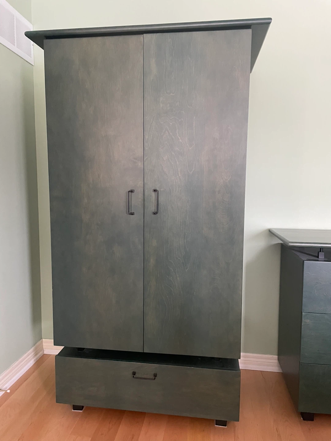 Here's a sturdy, green-stained wooden wardrobe! It features a double-door cabinet on top and a convenient pull-out drawer at the bottom. Great for extra storage in a bedroom or hallway