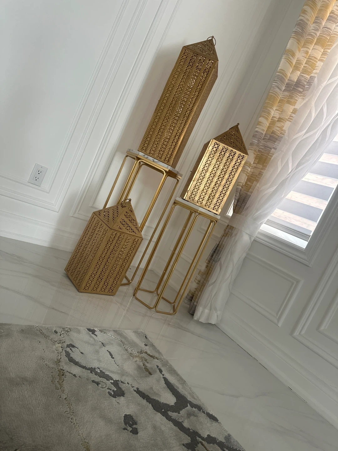 A set of three decorative gold metal lanterns, each with intricate cut-out patterns and a tapered top. These lanterns are designed to hold candles or LED lights for ambient illumination. Made from durable metal, they're perfect for adding a touch of elegance to any indoor or outdoor space. The set includes lanterns of varying heights, with accompanying gold metal stands topped with white marble-look surfaces.