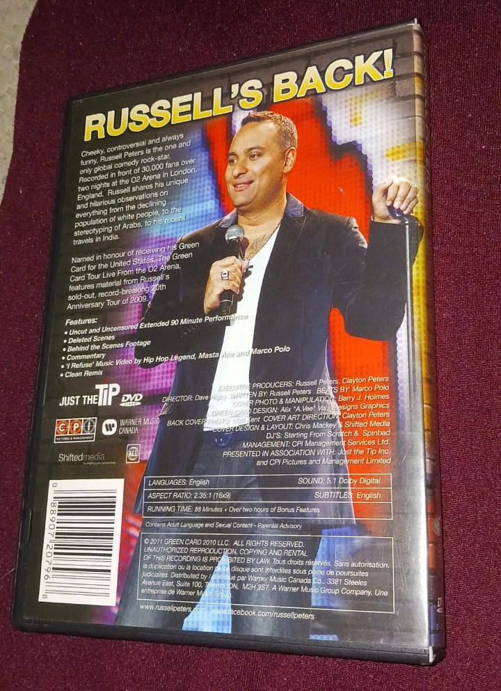 This DVD features Russell Peters' The Green Card Tour, including the extended 90-minute performance. It also contains a clean remix, behind-the-scenes footage, and deleted scenes. The disc is in its original case.