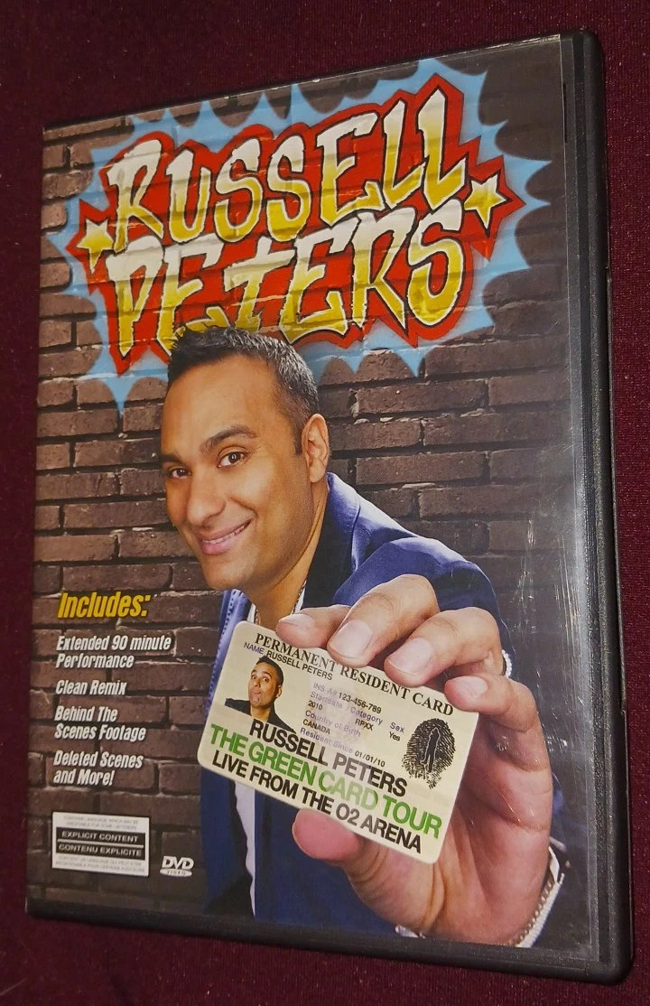 This DVD features Russell Peters' The Green Card Tour, including the extended 90-minute performance. It also contains a clean remix, behind-the-scenes footage, and deleted scenes. The disc is in its original case.