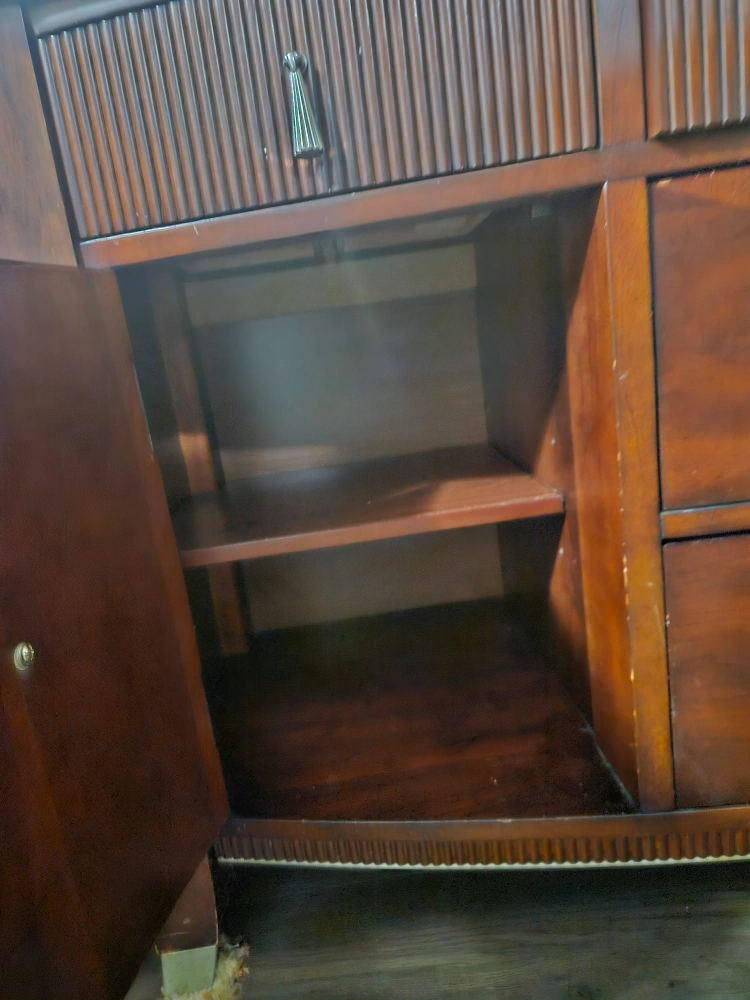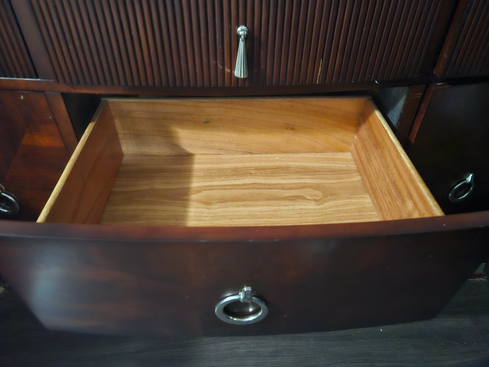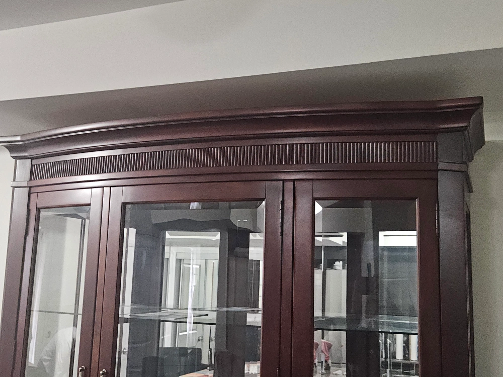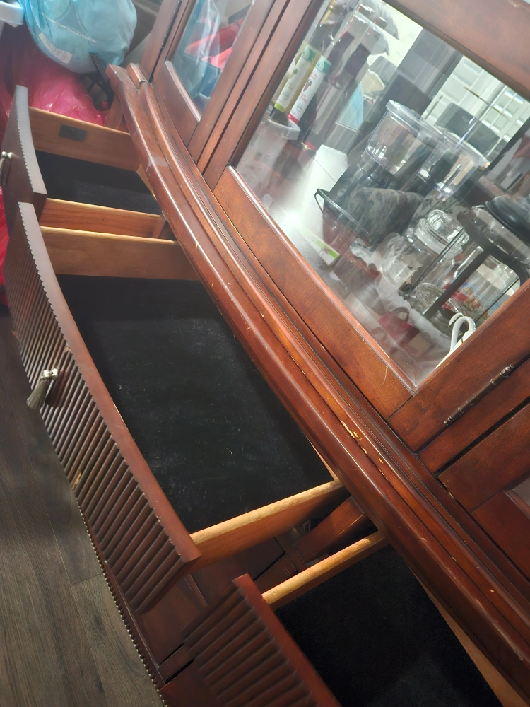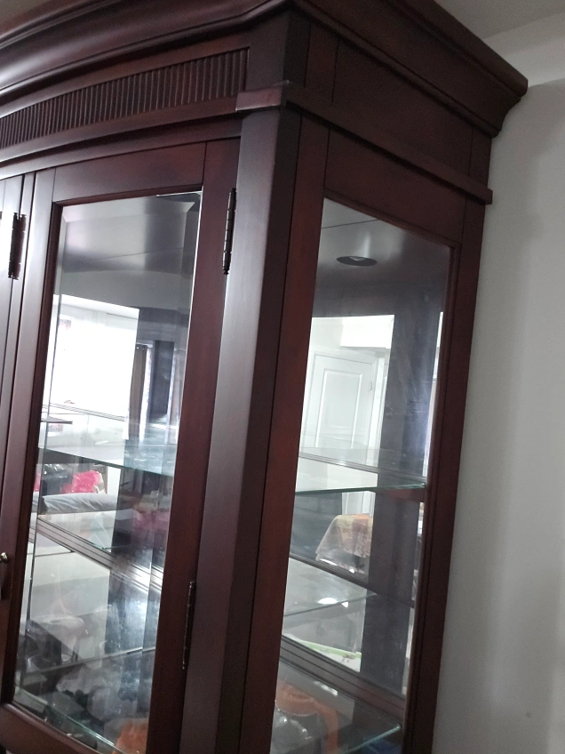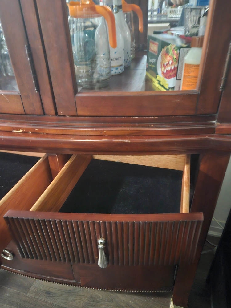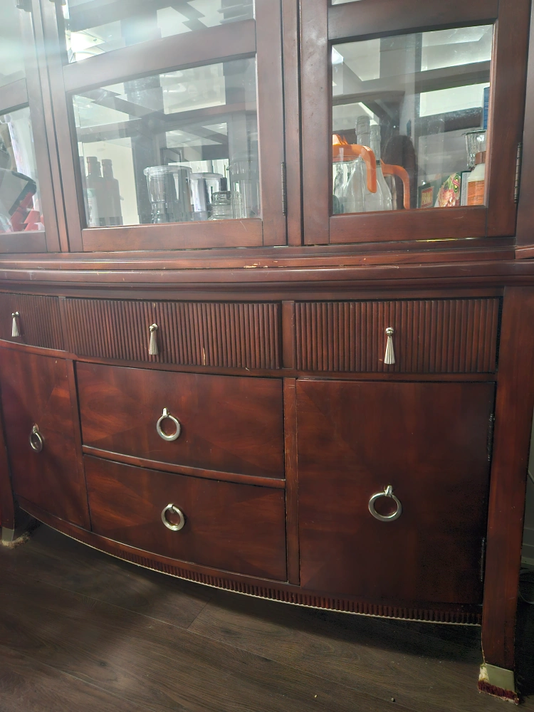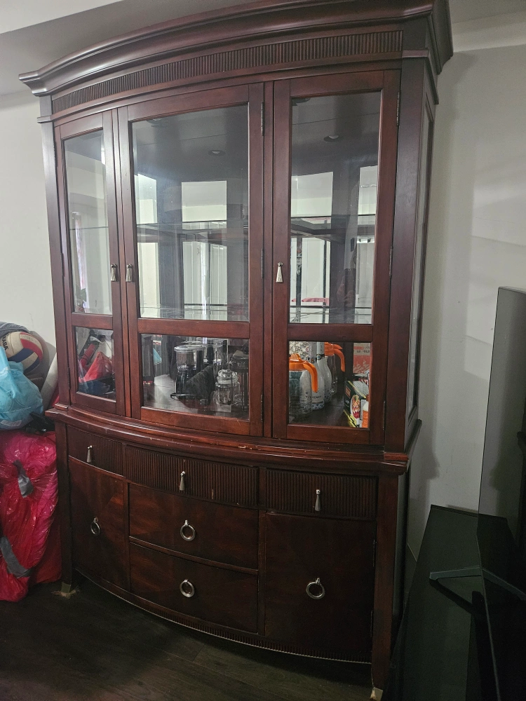 This curio cabinet features glass doors, shelves, drawers and a large storage area on the bottom. It is made of wood. It is perfect for displaying your favourite treasures! Colour is a rich mahogany. All drawers and doors work perfectly. Experienced some wear and tear from moves (chips, scratches), but nothing that cannot be fixed. Purchased at Thr Brick in mid-2000s as part of a set that retailed for $2000.00. Must go by September 15th!! Place your offers.