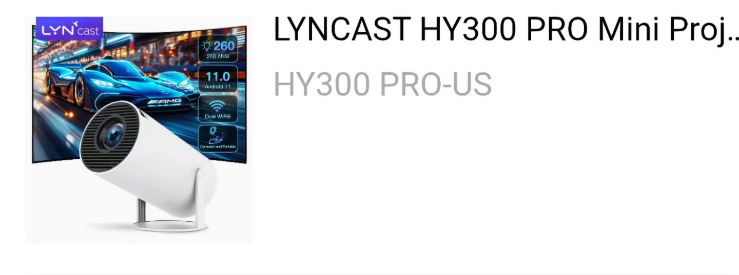 This is the LYNCAST HY300 PRO mini projector. It's compact and portable with dual WiFi. Features 260 ANSI lumens and Android 11. Great for presentations on the go!