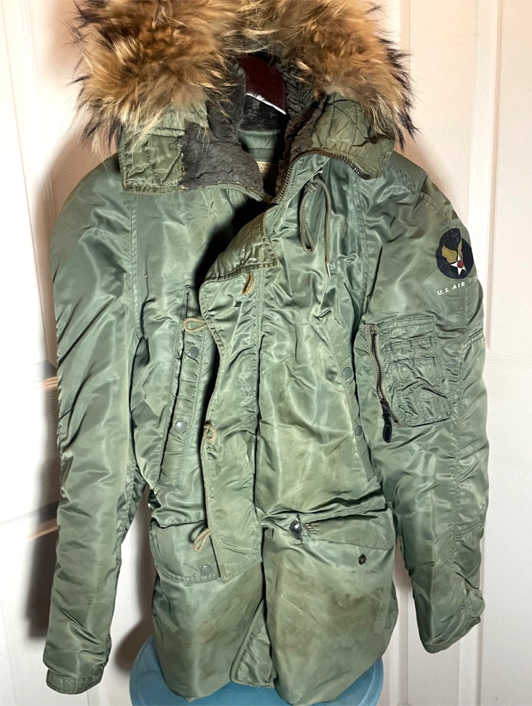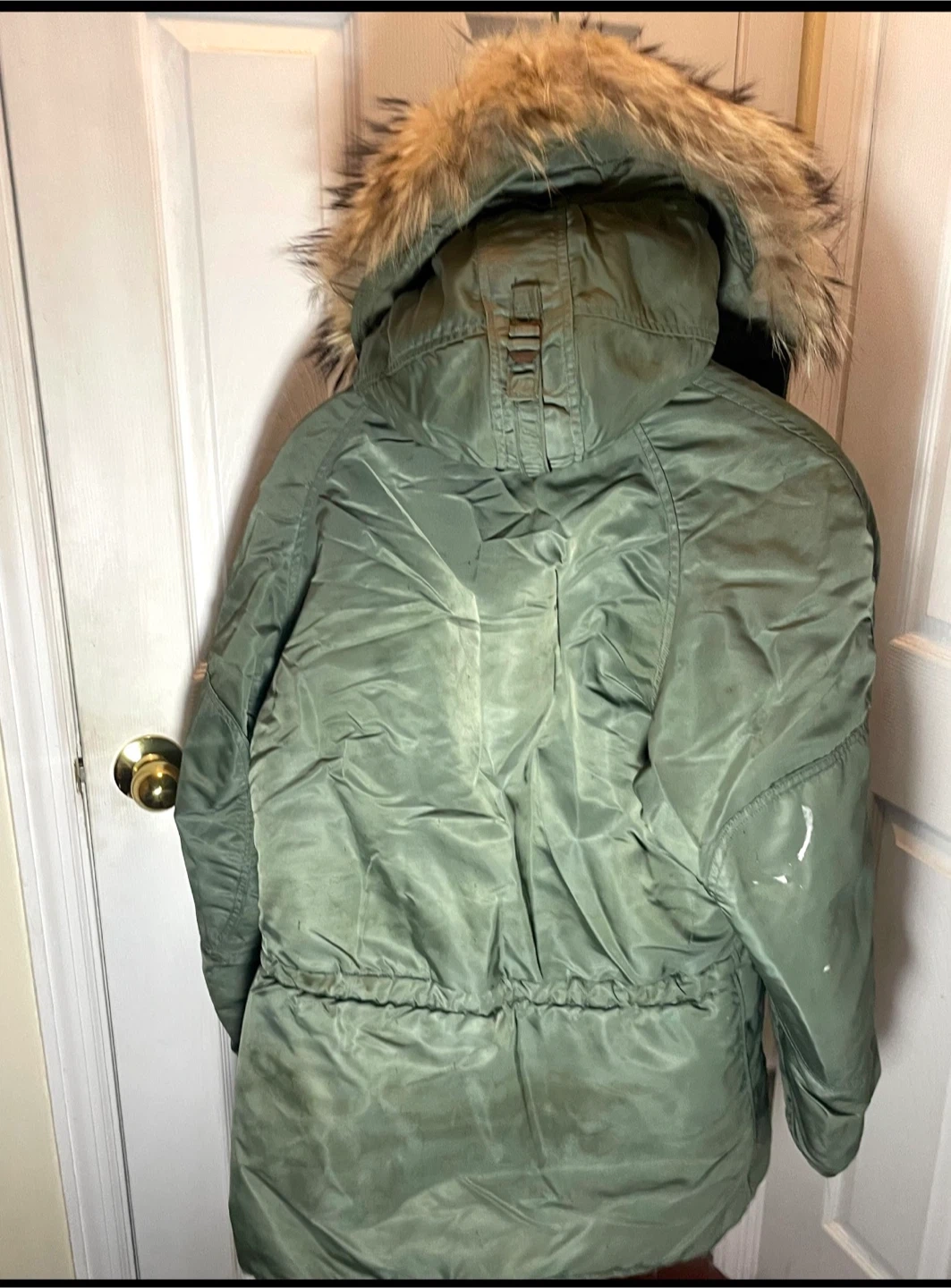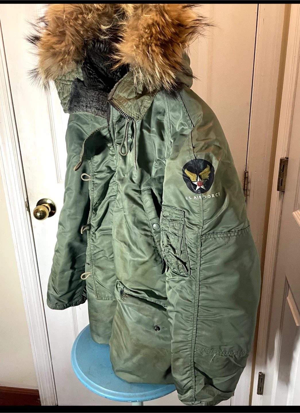 This is a vintage US Air Force winter parka jacket with a fur-lined hood. It's a warm and durable outerwear option. The jacket features multiple pockets and a zippered front closure.