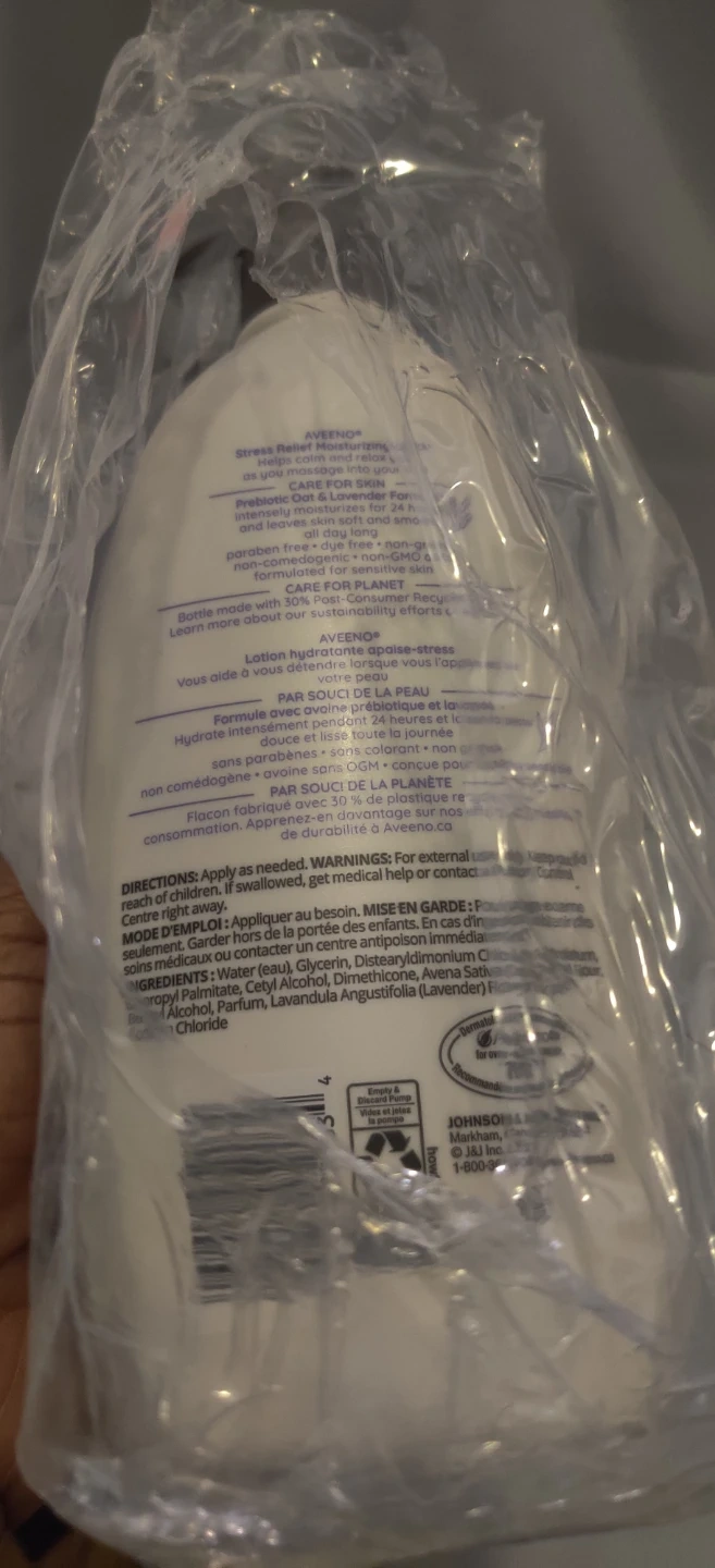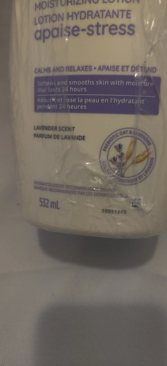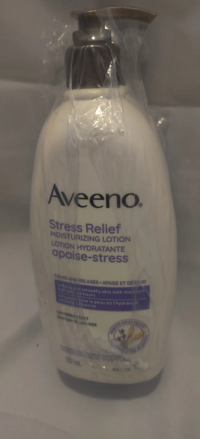 2 Aveeno Stress Relief Moisturizing Lotion comes in a 532 mL bottle and features a calming lavender scent. It's formulated with prebiotic oat and lavender to soften and smooth skin with moisture that lasts 24 hours. Dermatologist recommended. This lotion is great for sensitive skin.