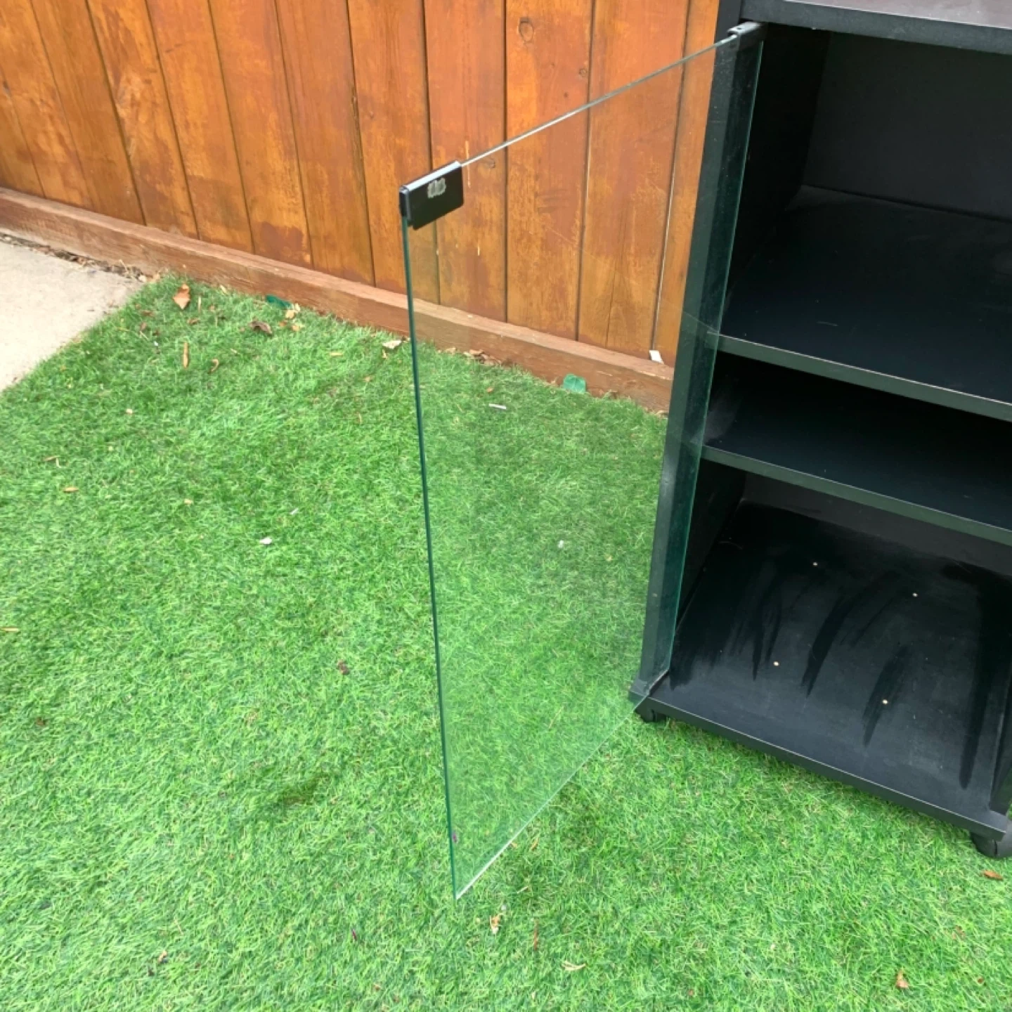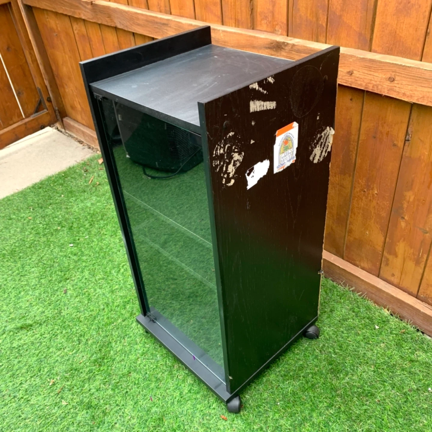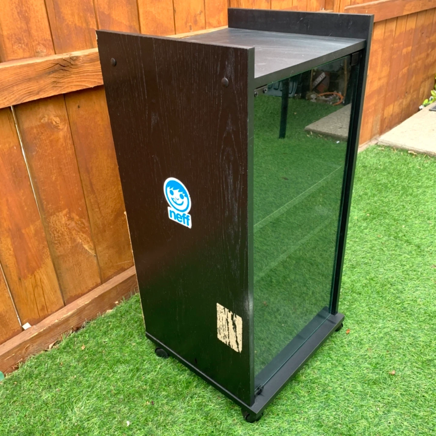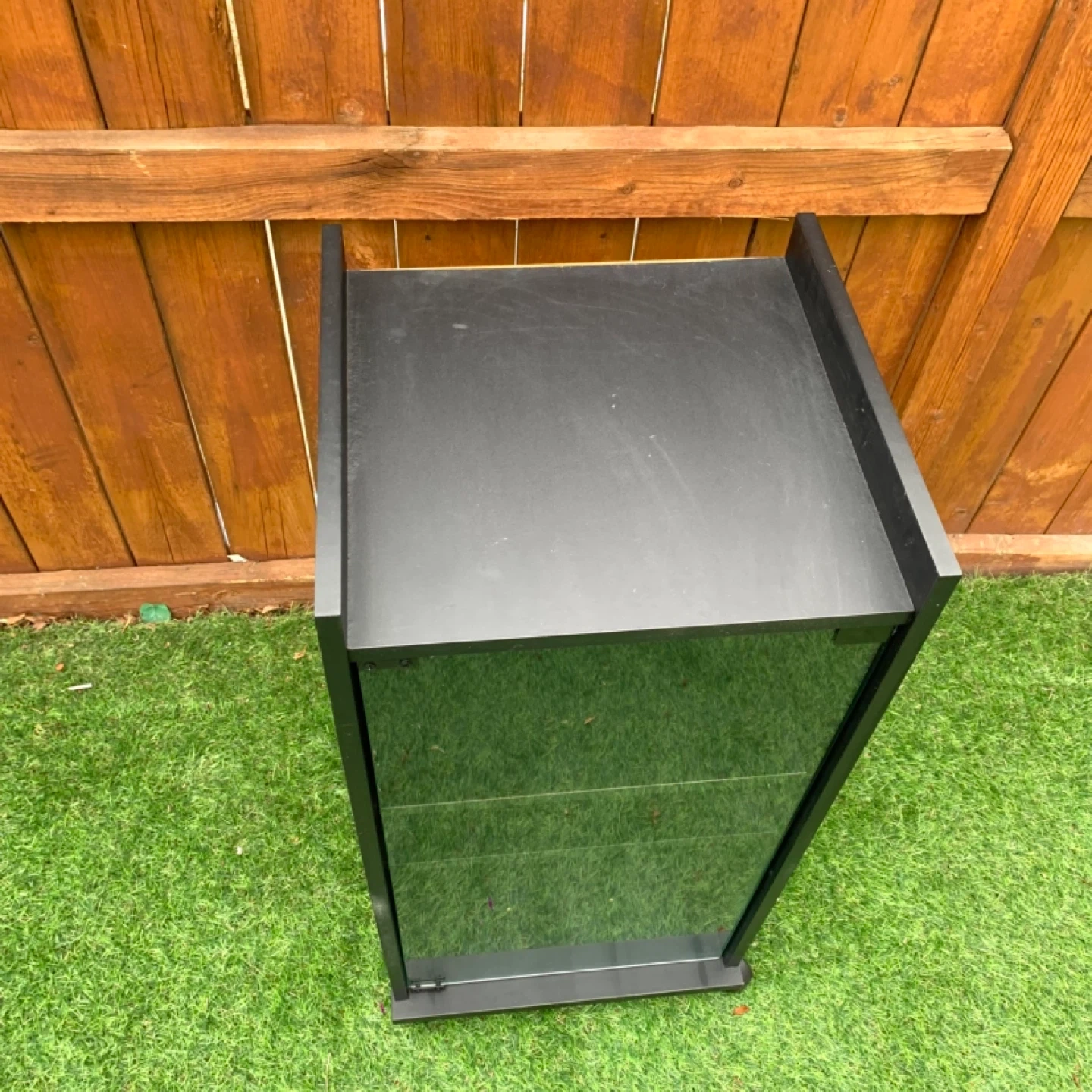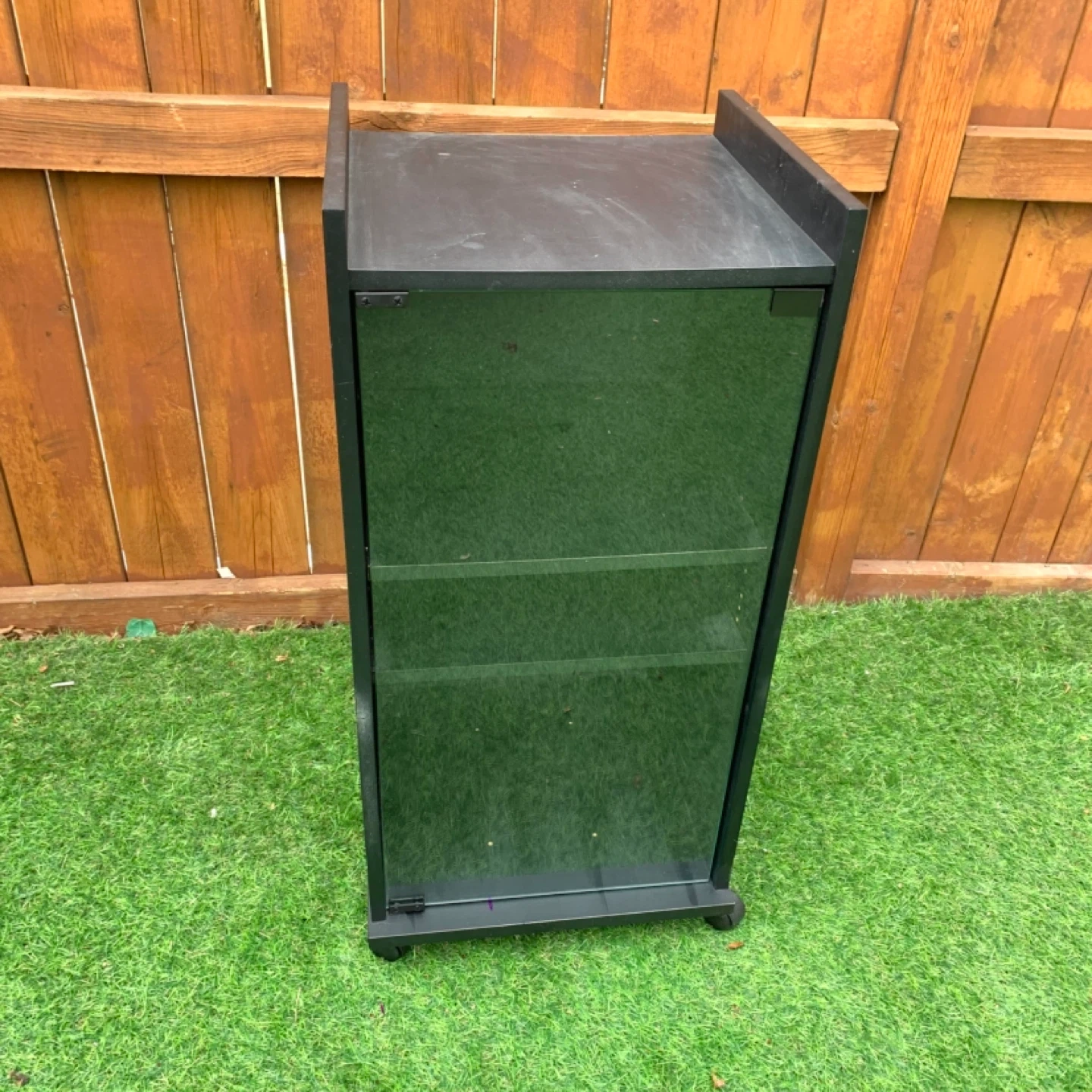Black display cabinet glass door with shelves perfect for displaying collectibles, decor, or small items in living room, bedroom, or office. Compact storage unit with two shelves and wheels for easy movement, making it practical and versatile for small spaces. Note: stickers removed have affected paint on the sides but overall still functional and great for use.