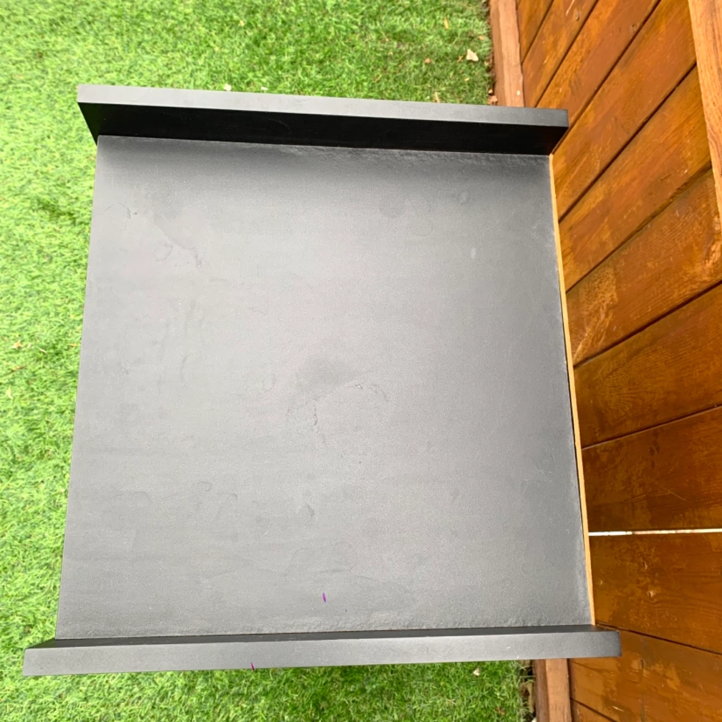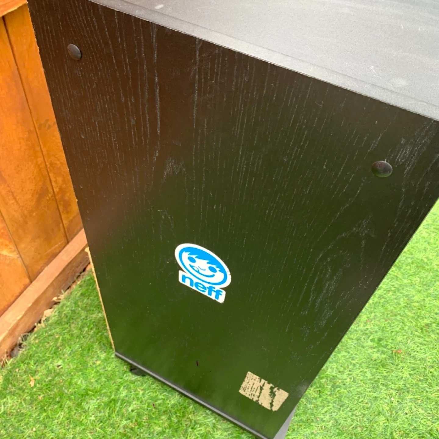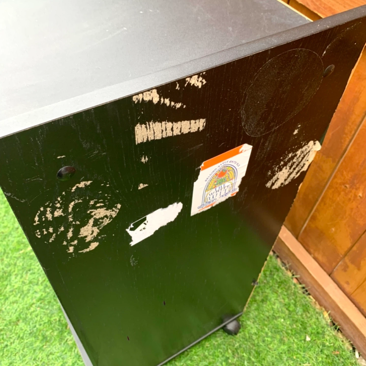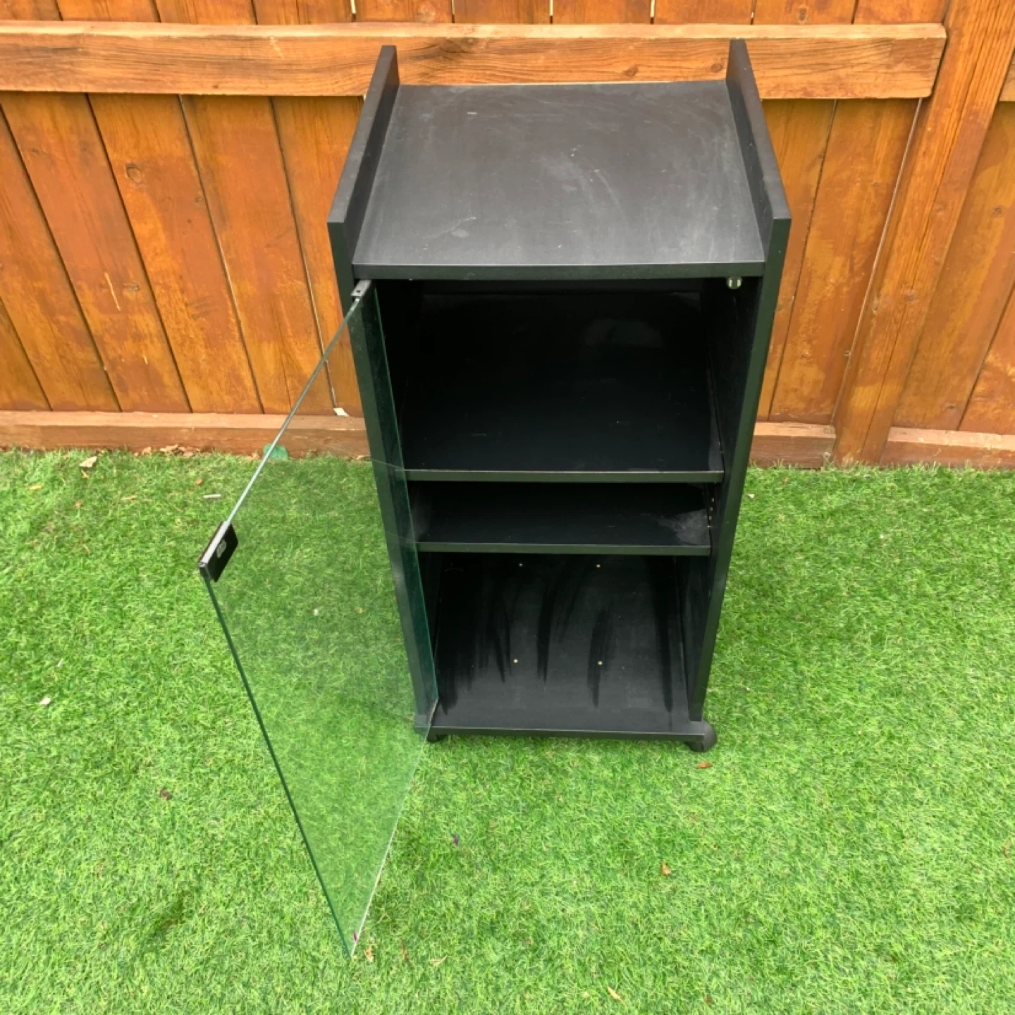 Black display cabinet glass door with shelves perfect for displaying collectibles, decor, or small items in living room, bedroom, or office. Compact storage unit with two shelves and wheels for easy movement, making it practical and versatile for small spaces. Note: stickers removed have affected paint on the sides but overall still functional and great for use.
