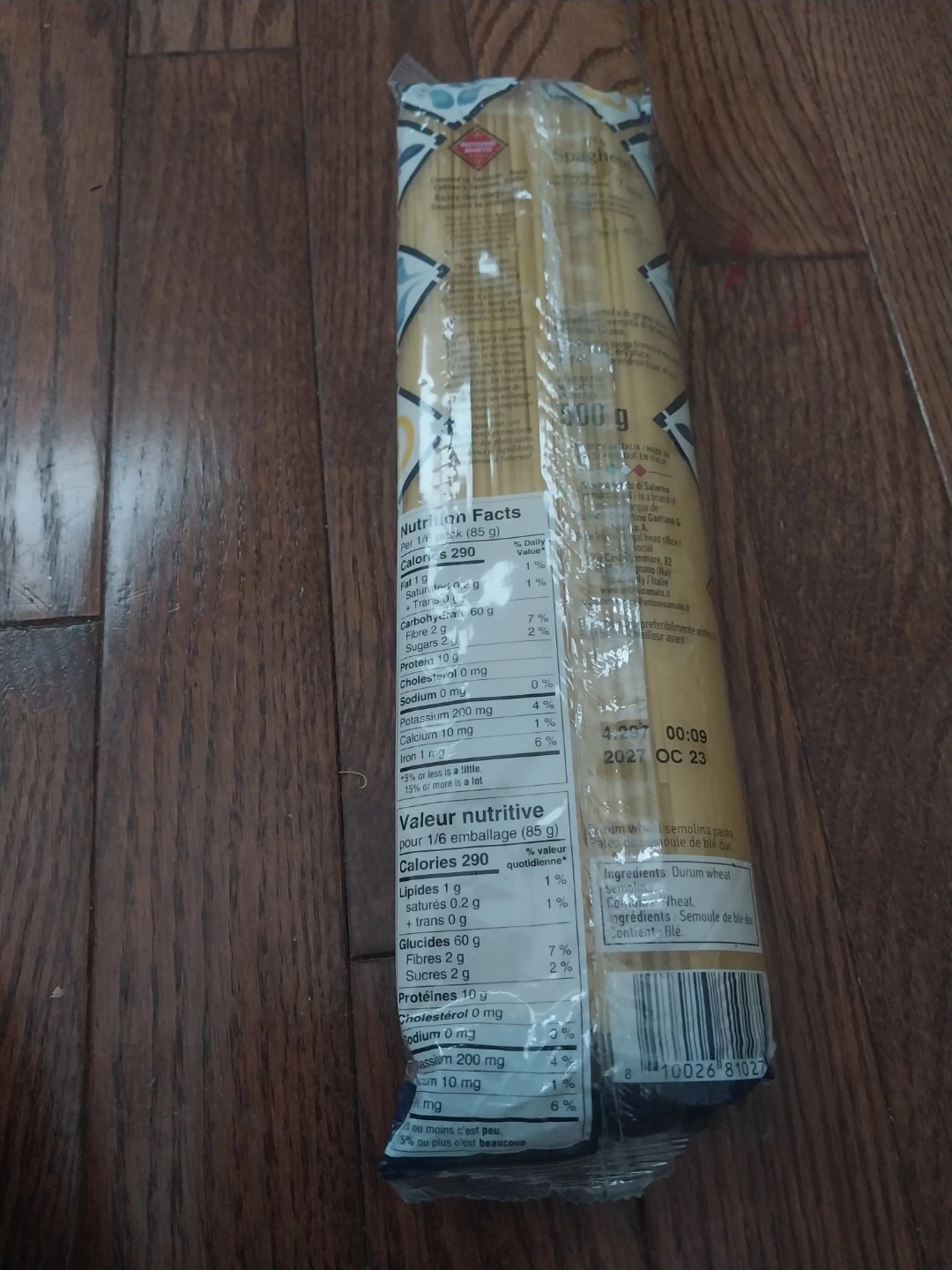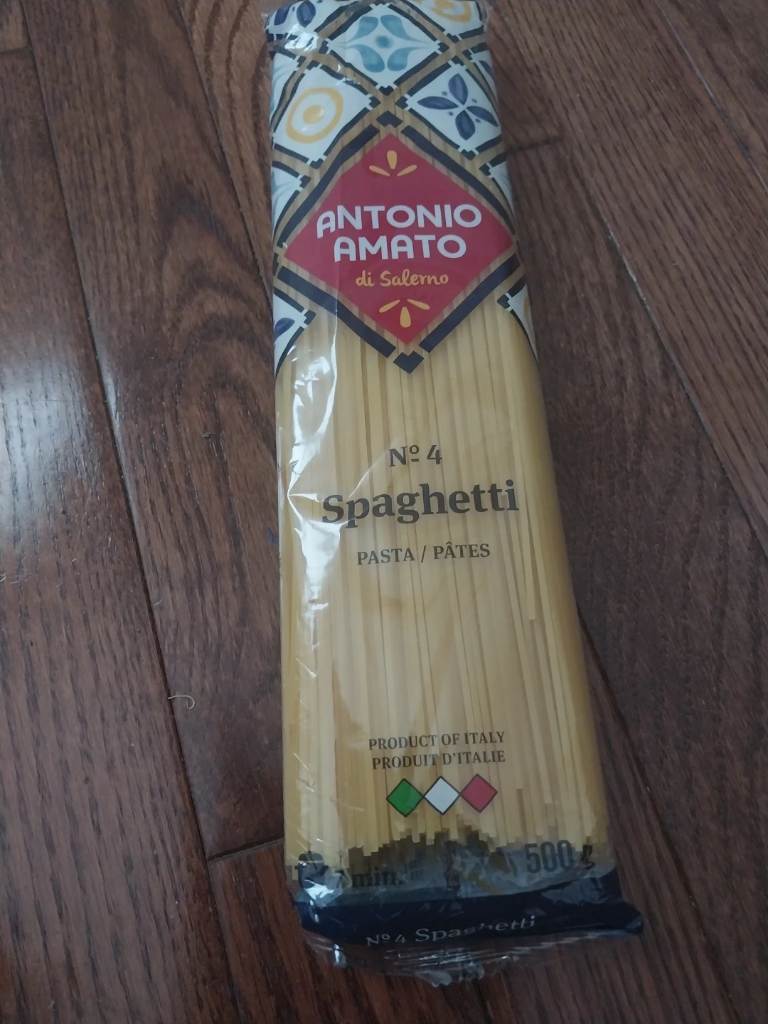 Antonio Amato di Salerno No. 4 Spaghetti pasta. It's a 500g package and a product of Italy. This semolina pasta is made from durum wheat. Expiry date is October 2027.