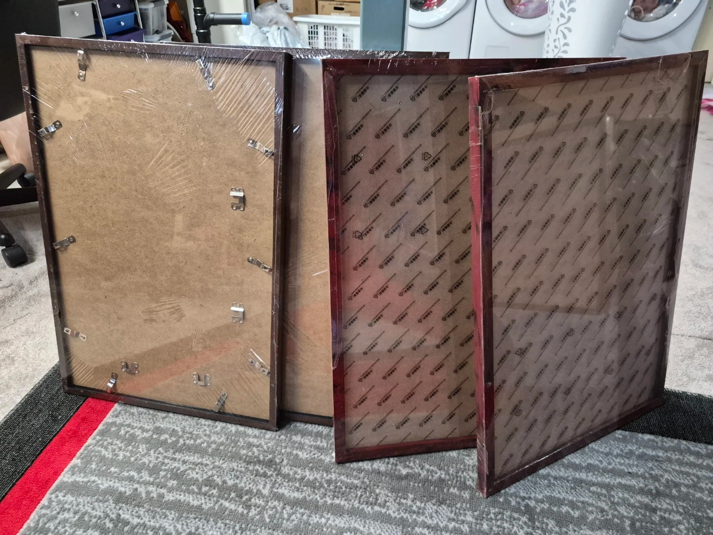 Set of four picture frames with 2 red and 2 dark wood-look finish. Frames are shrink-wrapped and ready for use.