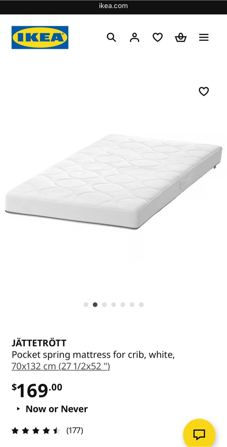 This is an IKEA JÄTTETRÖTT pocket spring mattress for a crib. It's white and measures 70x132 cm (27 1/2x52 ").