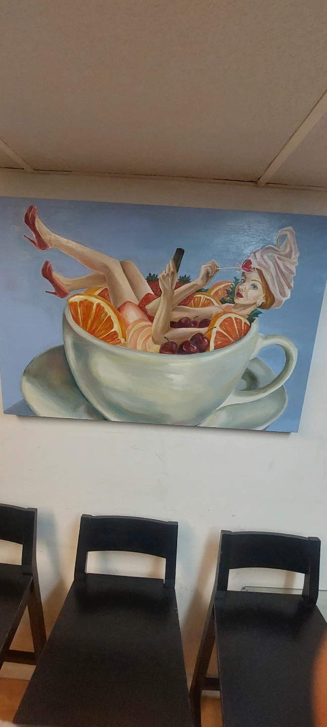 Large colourful painting. Features a woman in a giant teacup with fruit. Great statement piece for home or business. Excellent condition. hand painted. wood canvas