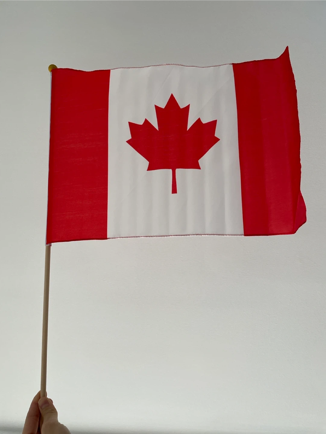 Show your Canadian pride with this handheld flag. It's made of fabric with a wooden stick and a gold ball topper. Perfect for parades, sporting events, or decorating your space!