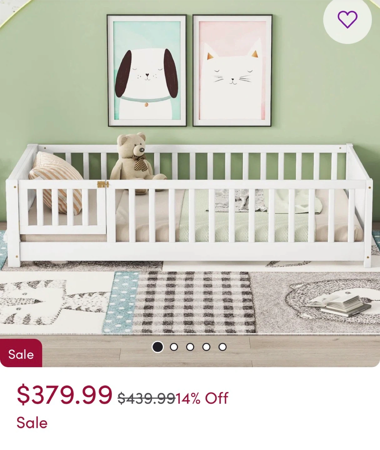 This white toddler bed features sturdy wooden guard rails for safety. It's made of wood and has a slatted base. Perfect for transitioning your little one to a bigger bed!