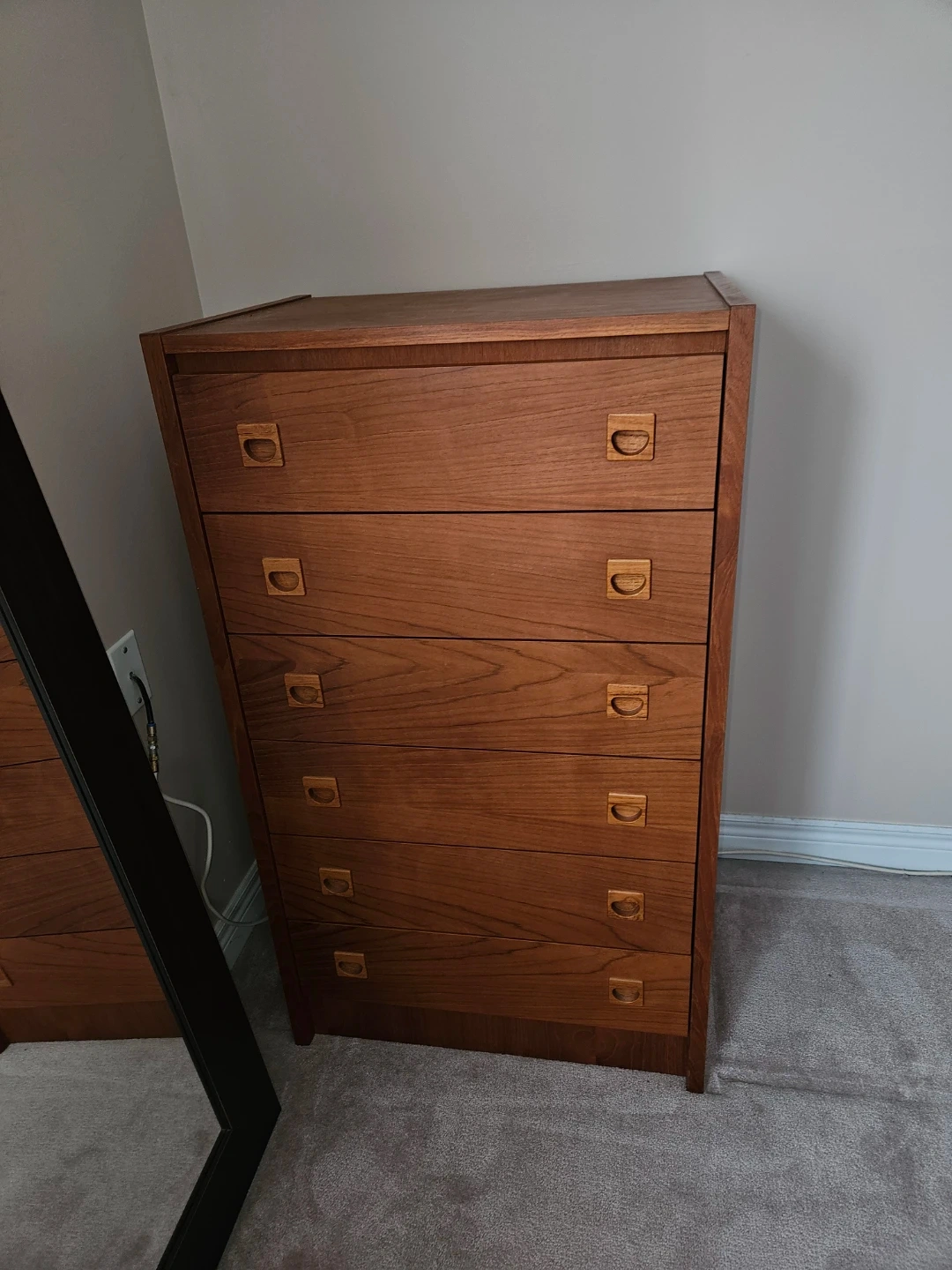 A wooden dresser with six drawers, featuring a rich wood finish and distinct square pulls. It's a classic piece for bedroom storage. Plenty of space for clothes!