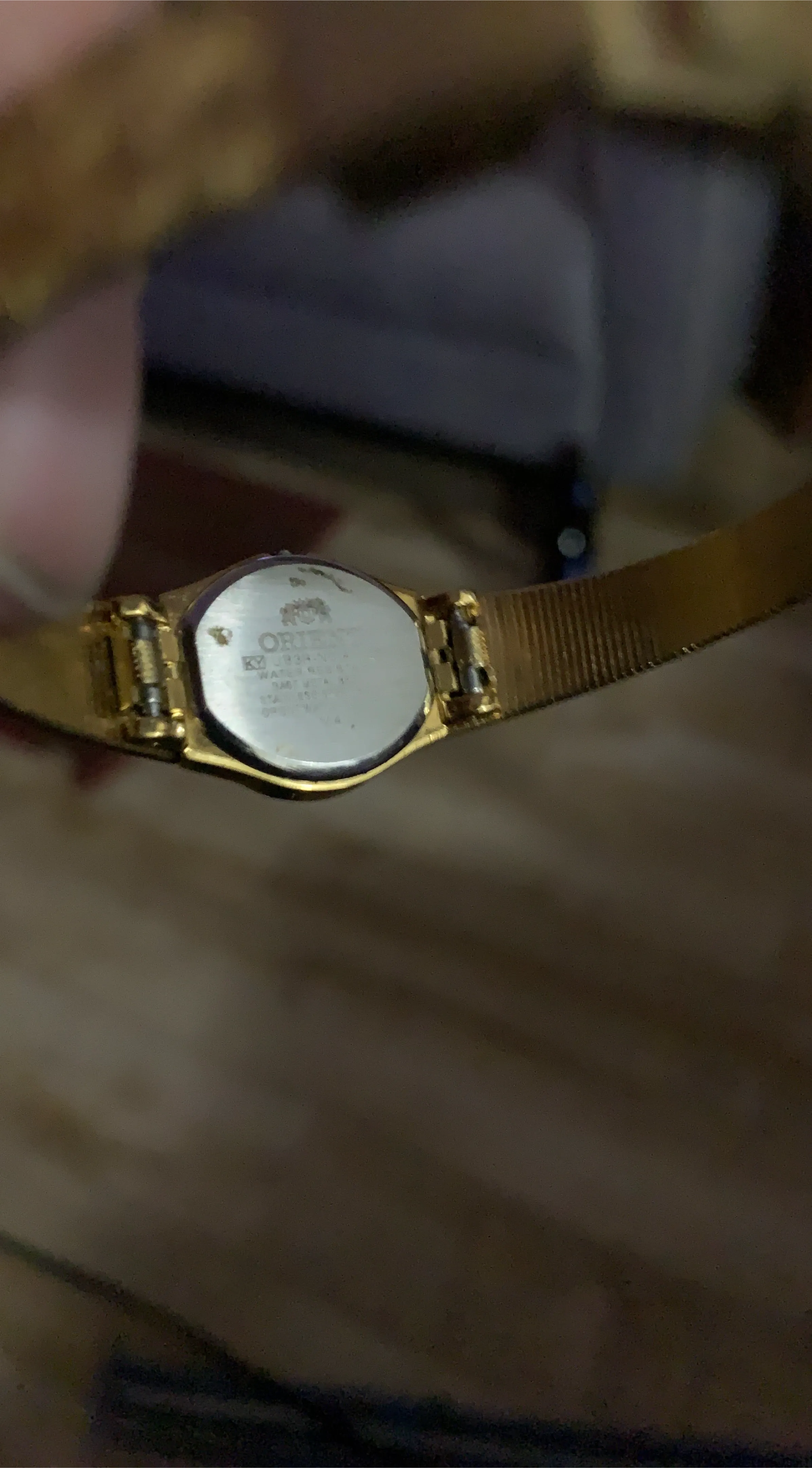 This is a vintage Orient watch with a gold-tone metal band. It's water-resistant. The back of the watch indicates it's made with base metal and stainless steel back.