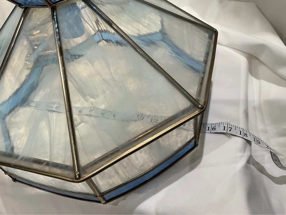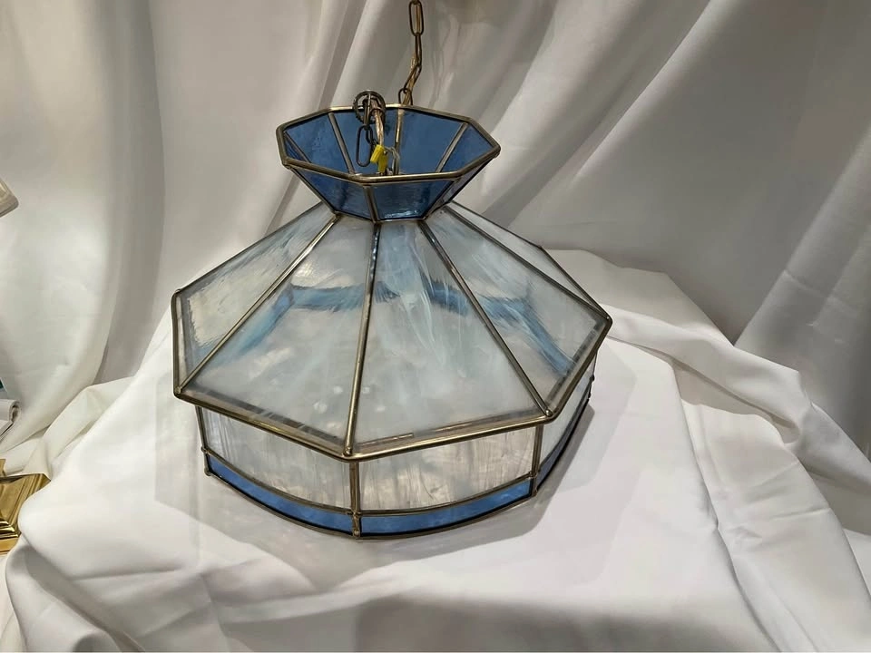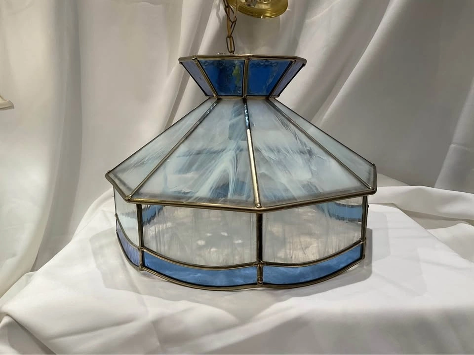 Tiffany Style Light Fixture Featuring Blue and Milk Glass Stained Glass In A Brass Frame. 16 inches Width, Height 13 inches. Good Condition. Smoke & Pet Free Home. #398/1200. Located in Richmond Hill, Bathurst & King Rd.