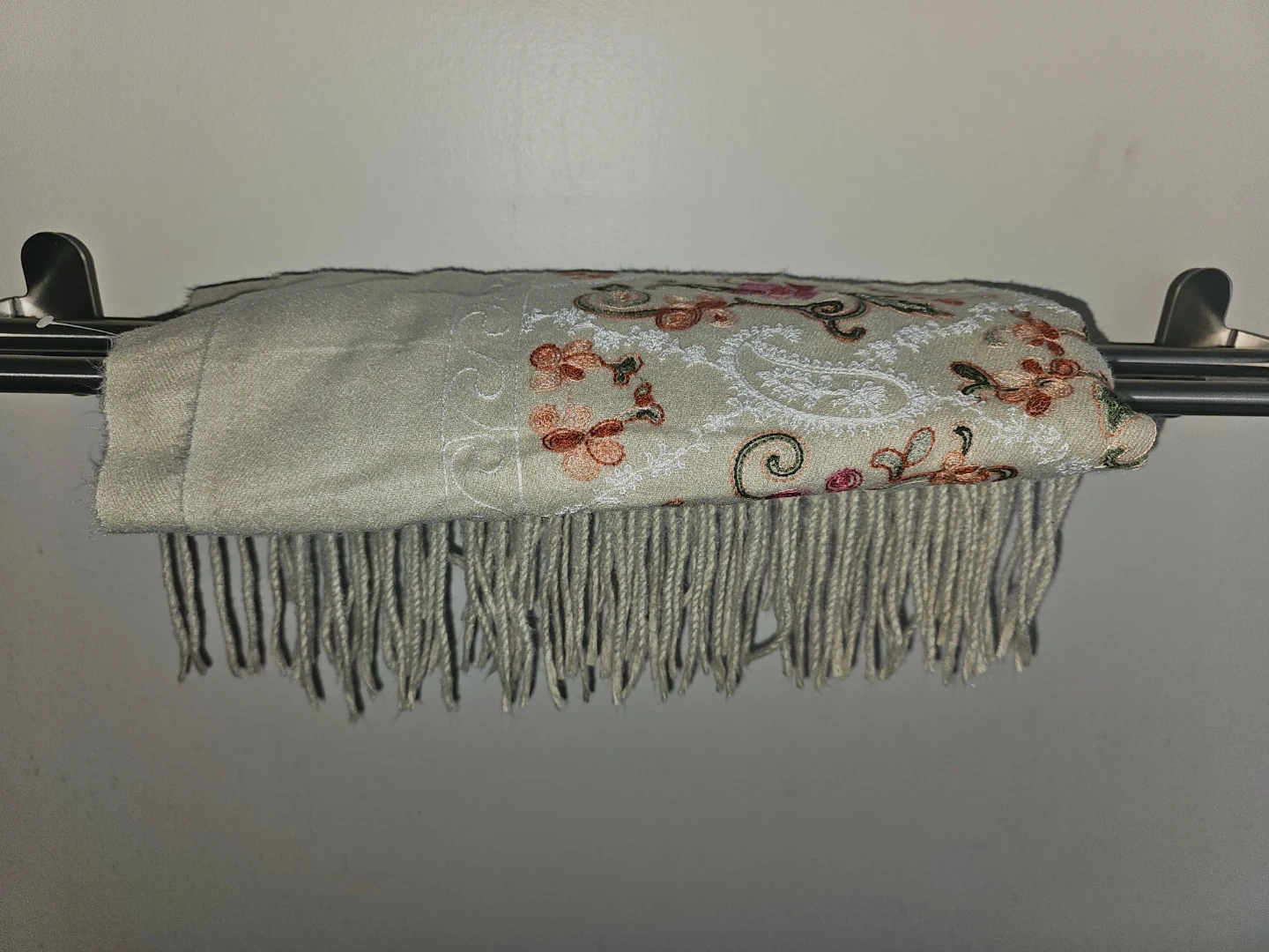 A beige Cashmere scarf featuring intricate floral embroidery and a delicate fringe. This stylish accessory adds a touch of elegance to any outfit. The soft fabric is comfortable for year-round wear.