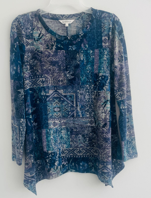 Blue and grey long sleeve top with a patchwork print. The top has a round neckline and a slight high-low hem. Made from a soft and comfortable material. Perfect for casual wear.