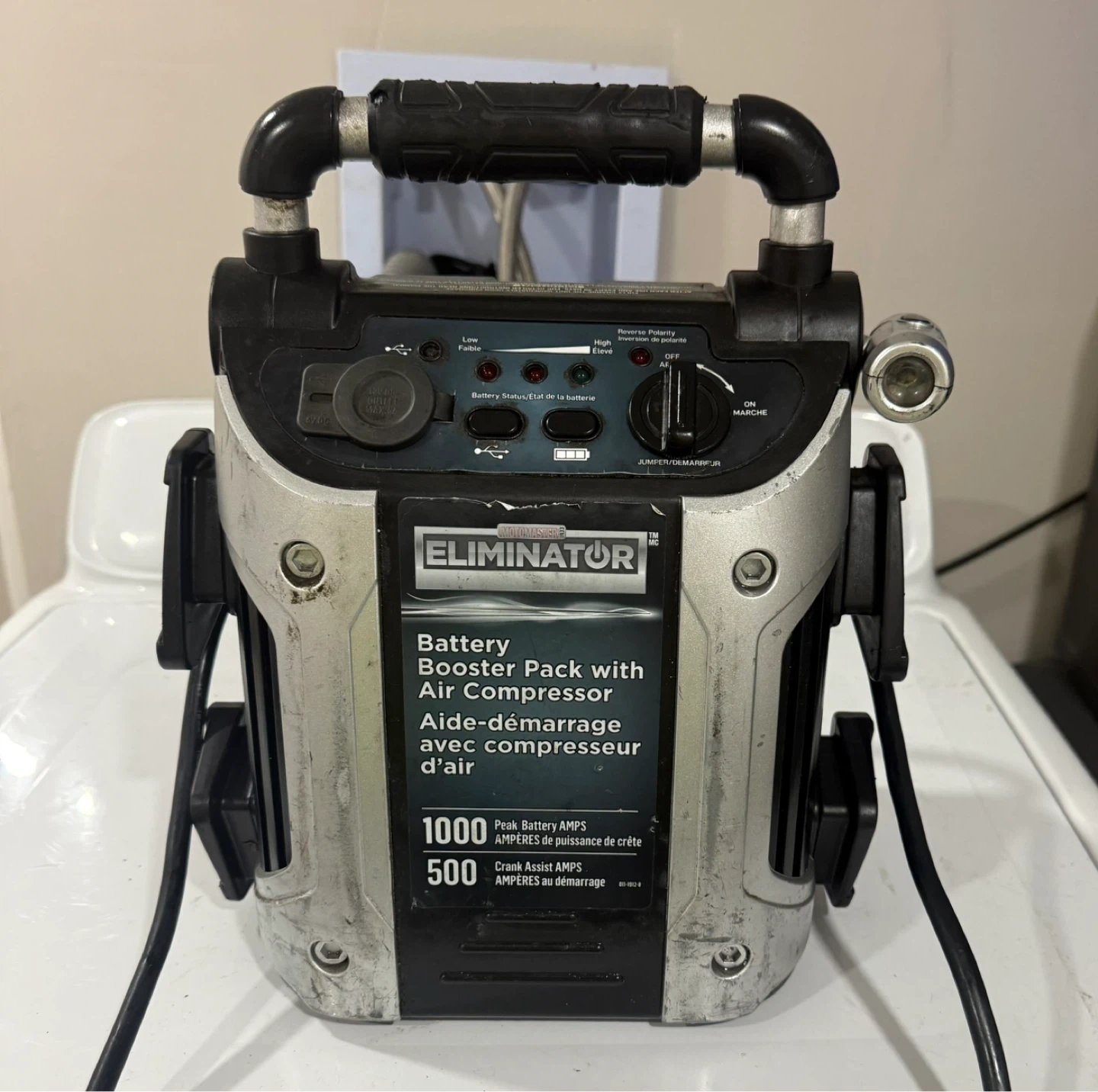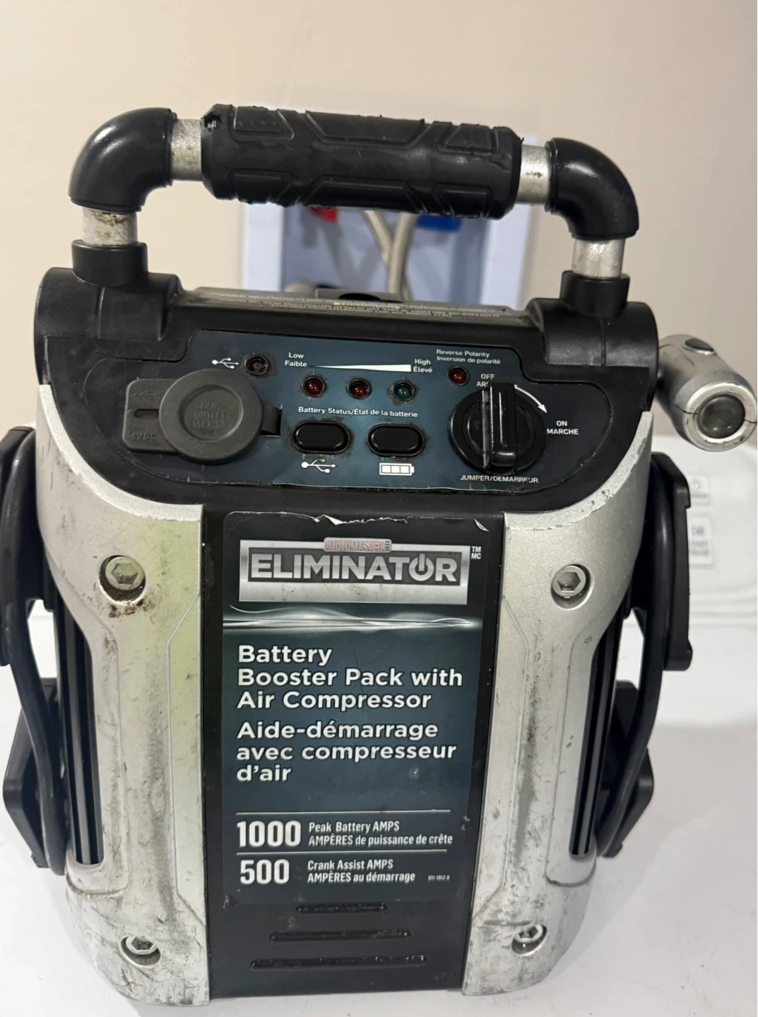 Master Force Eliminator Battery Booster Pack with Air Compressor. It provides 1000 Peak Battery AMPS and 500 Crank Assist AMPS. Includes an integrated air compressor for tire inflation.