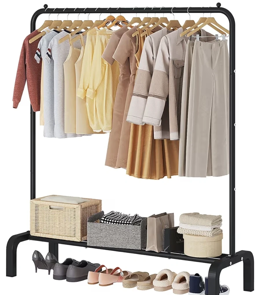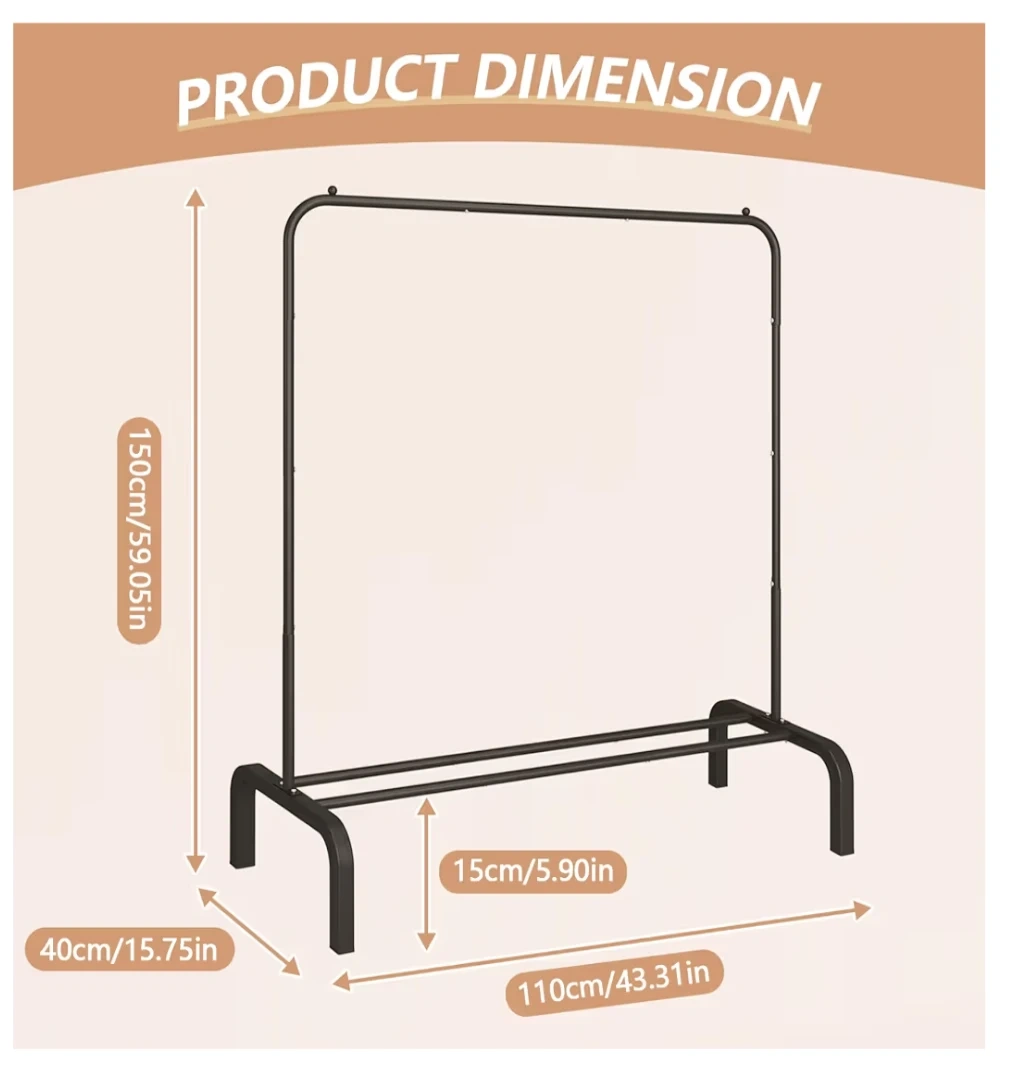 This sturdy black metal garment rack is 110cm wide, perfect for hanging clothes. It measures 150cm in height and 40cm in depth, offering ample space for your wardrobe. The lower shelf is ideal for shoes or storage baskets.