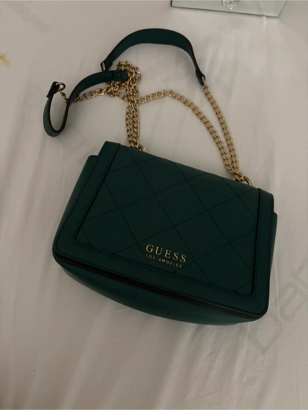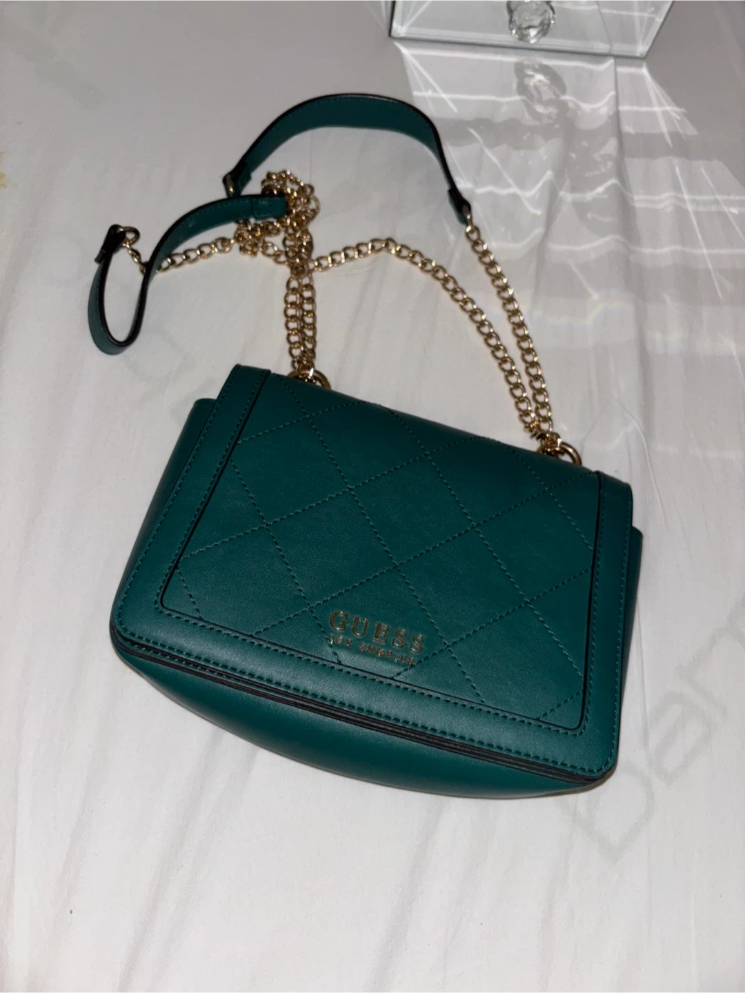 This is a green quilted shoulder bag from Guess. It features a gold chain strap and the Guess logo on the front flap. A stylish accessory for any occasion!