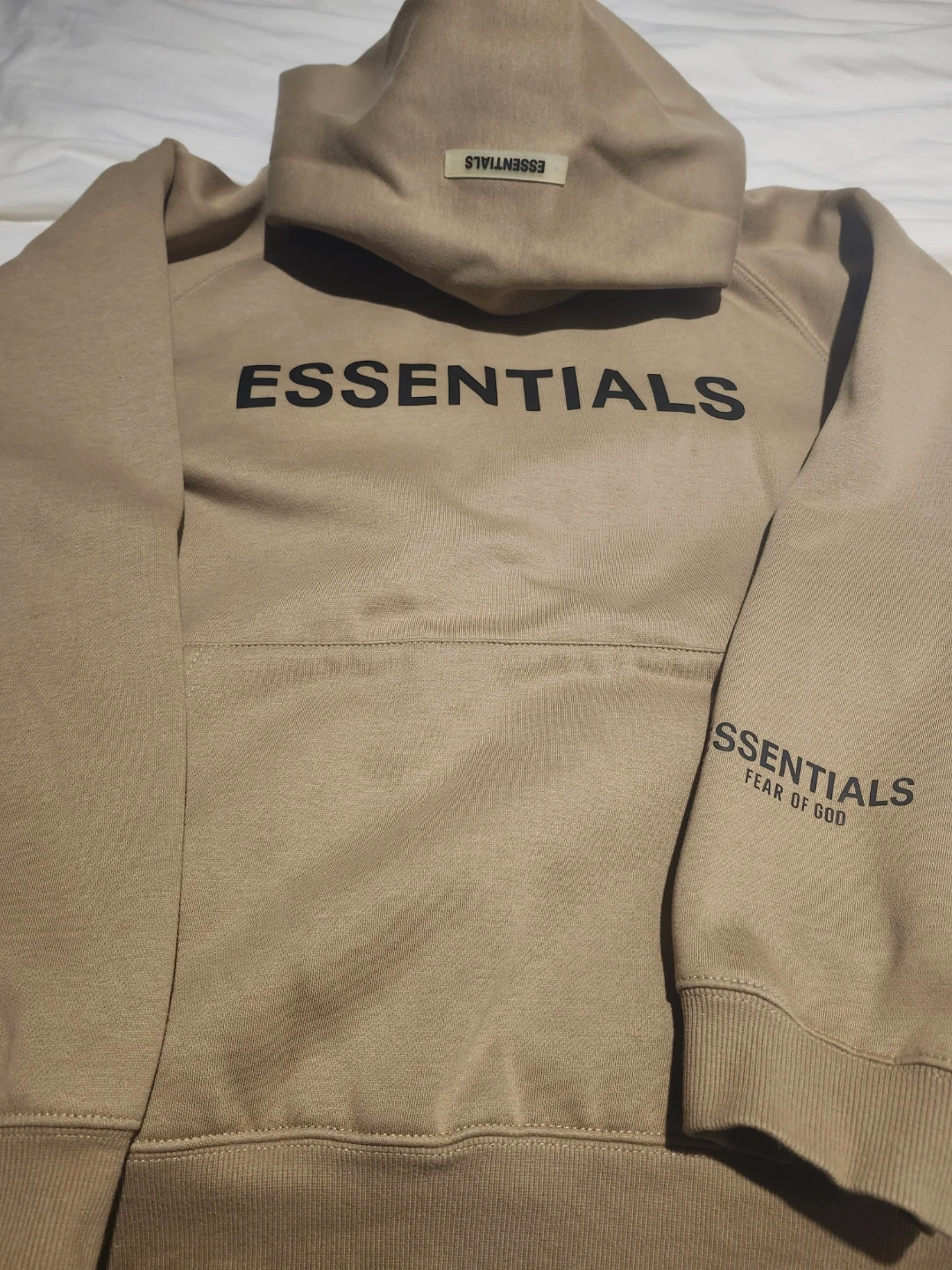 This is a tan FEAR OF GOD ESSENTIALS hoodie. It's made of a cotton blend for comfort. Great for casual wear!