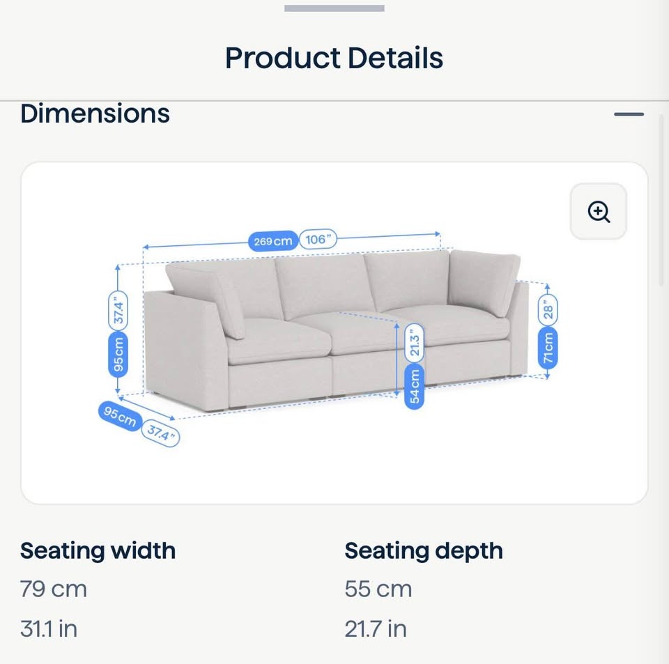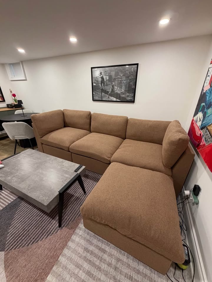 This is a 3 seater Cozey Ciello couch in mocha brown performance fabric. We bought it two months ago and have only sat on it a few times, so it's in like-new condition. The reason for selling is that the color doesn't quite work in our space. It's a 3-seater with a floating ottoman that has storage inside. Pickup is near Yonge and Eglinton. You will need to disassemble and move it yourself, but assembly is tool-free and very easy.