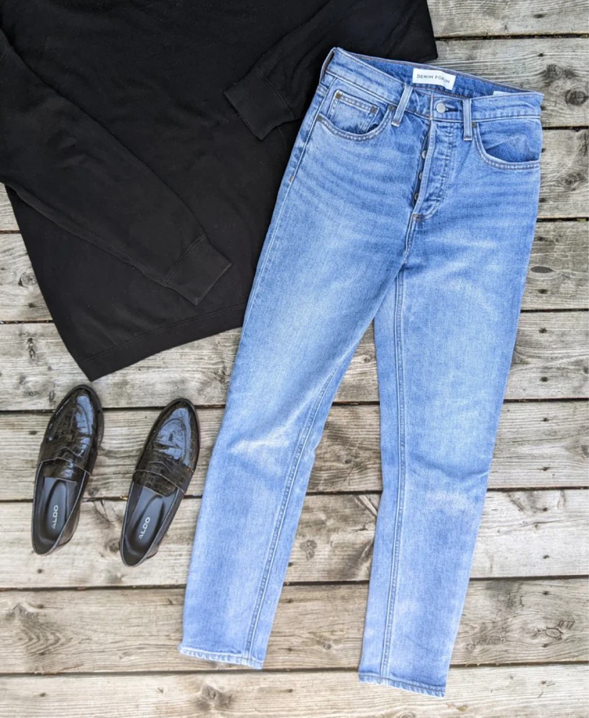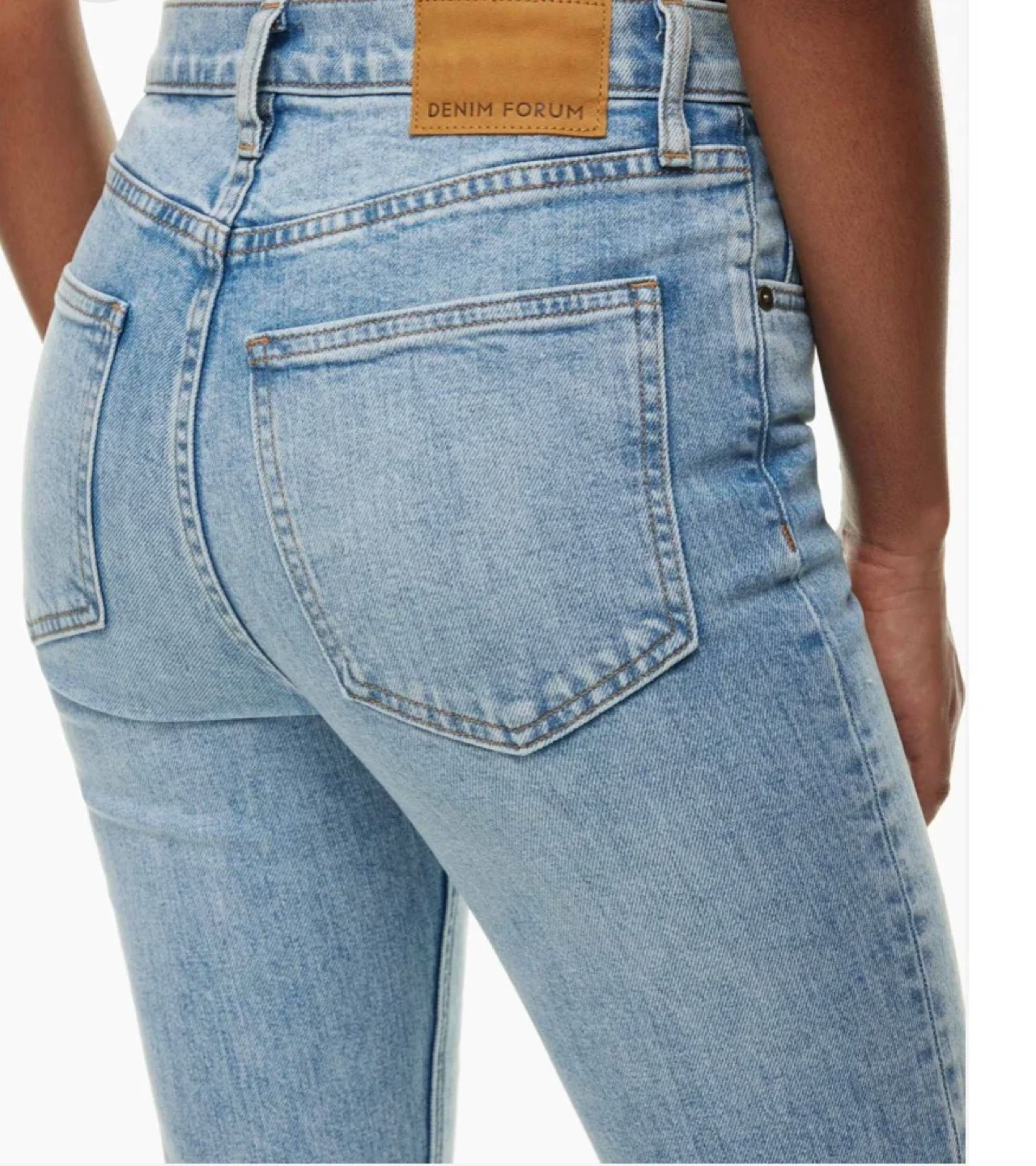 Classic light wash denim jeans from Denim Forum. Featuring a high rise and a slim leg silhouette. Cotton denim construction.