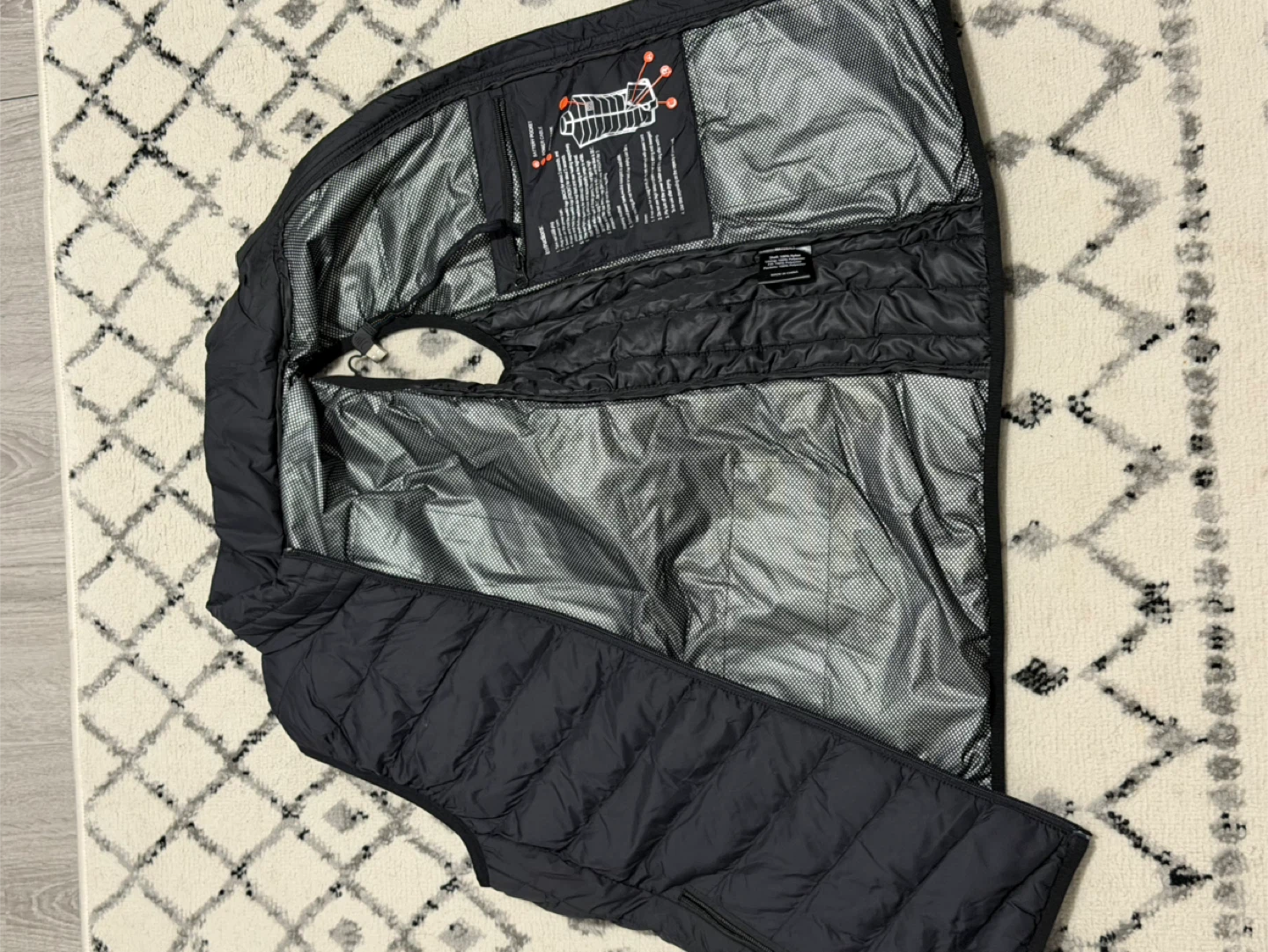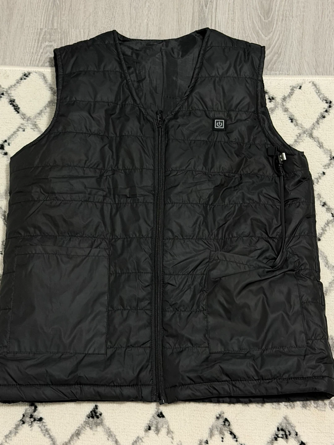 Black heated vest with a zippered front and two pockets. It has a power symbol on the chest indicating it's a heated garment. The interior is lined with a reflective silver material. Great for staying warm on chilly days!