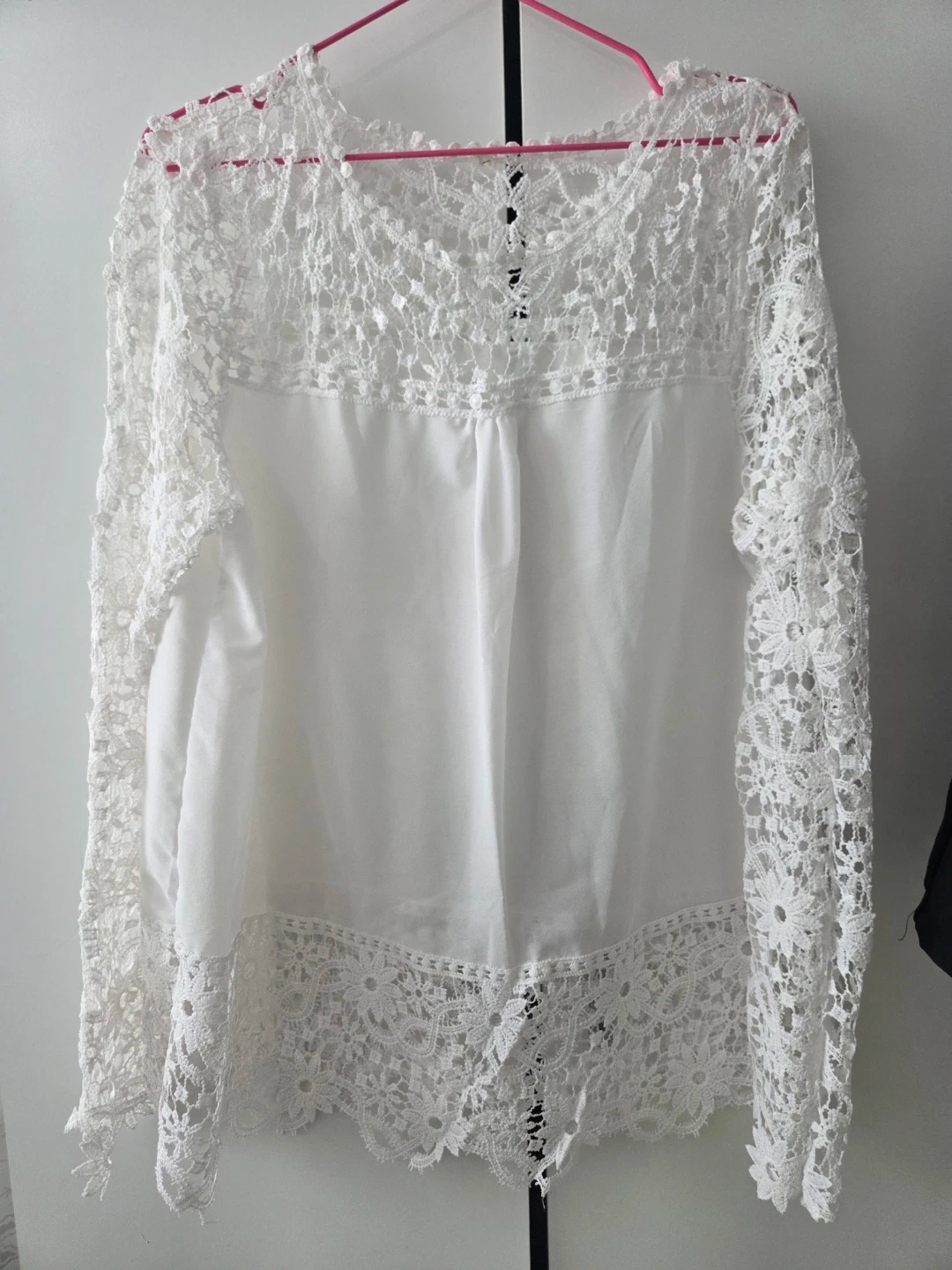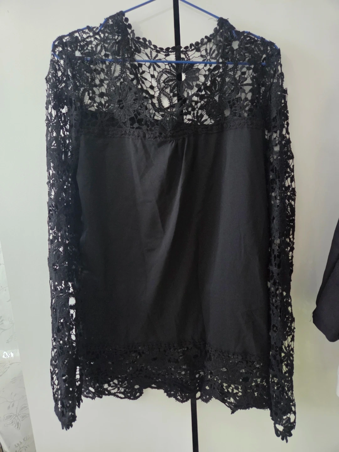 This black blouse features beautiful all-over lace detailing on the sleeves and hem. It's a stylish piece perfect for dressing up an outfit. The fabric appears to be a lightweight polyester blend.