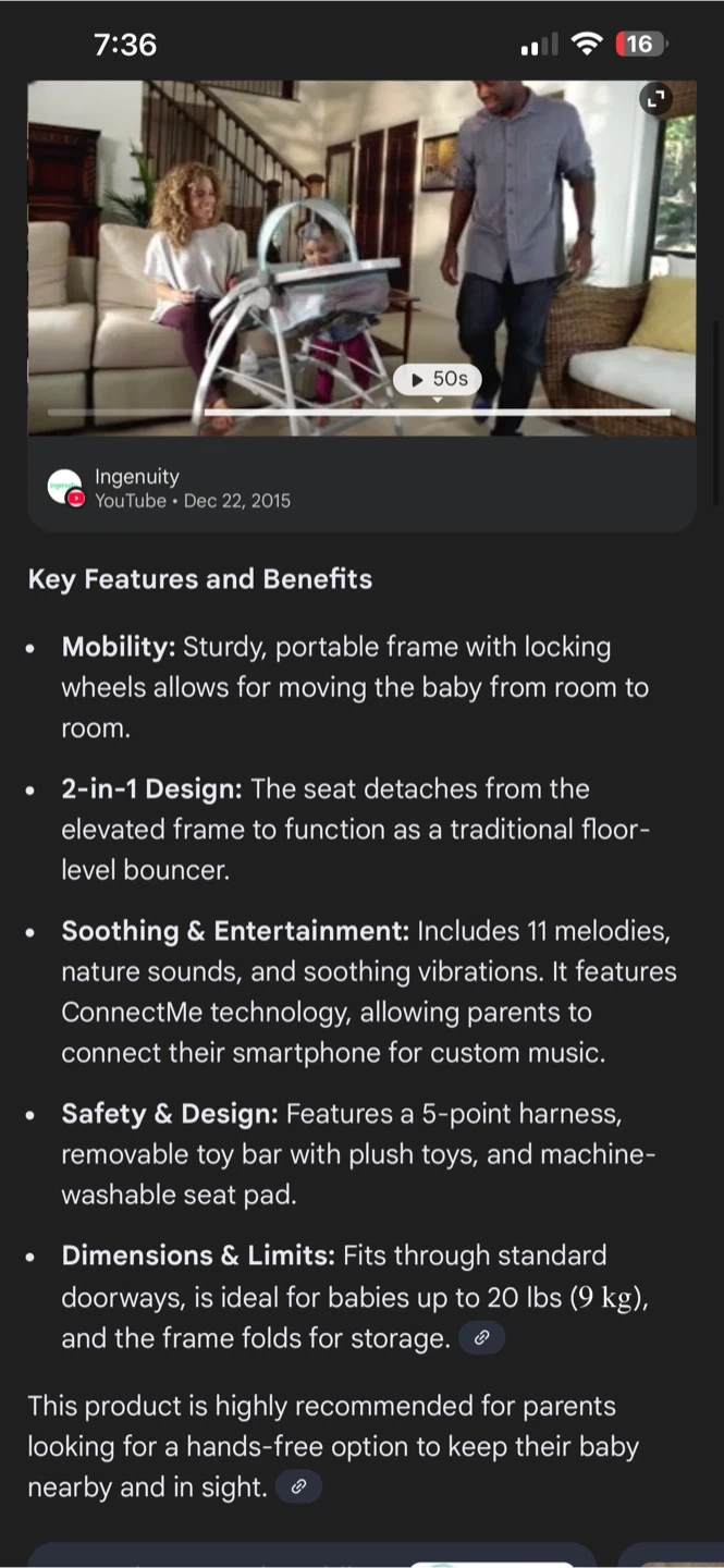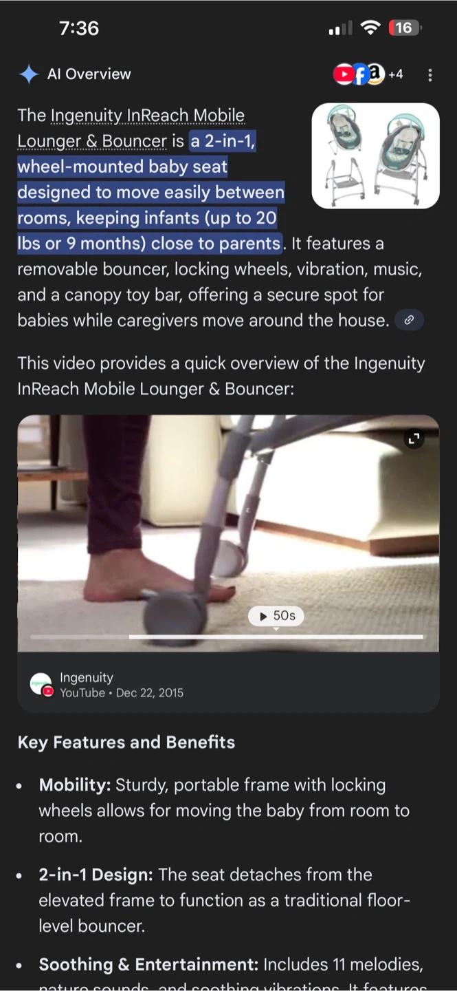 This Ingenuity InReach Mobile Lounger. It's designed to move easily between rooms and keep infants up to 20 lbs comfortable. Features include , locking wheels, vibration ( never used . Not sure if it works) music, and a canopy toy bar.
