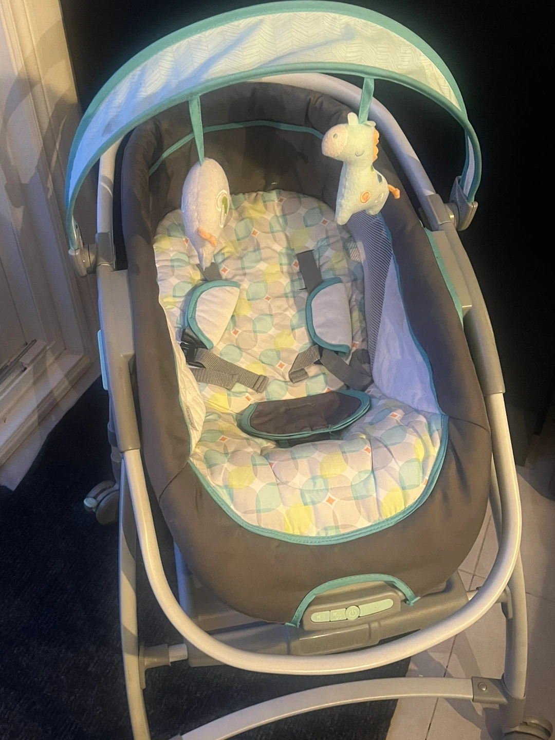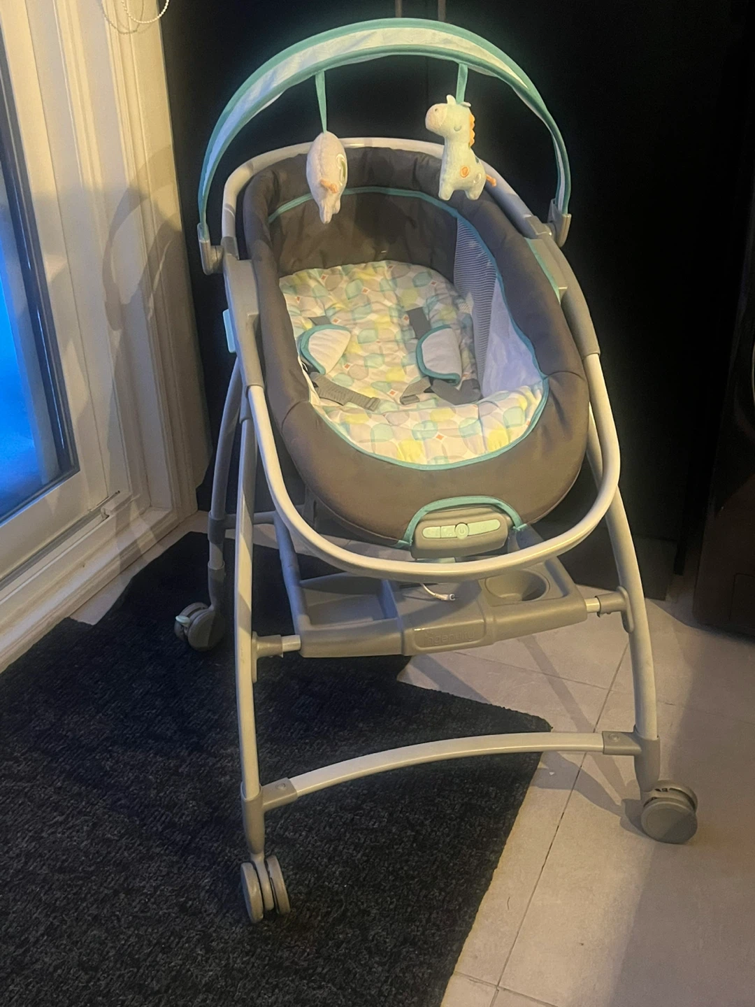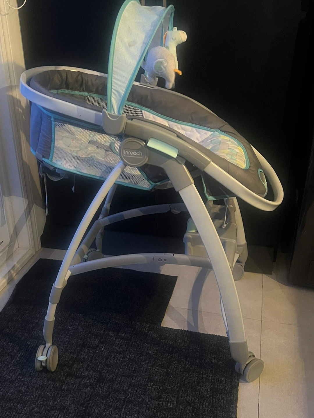 This Ingenuity InReach Mobile Lounger. It's designed to move easily between rooms and keep infants up to 20 lbs comfortable. Features include , locking wheels, vibration ( never used . Not sure if it works) music, and a canopy toy bar.
