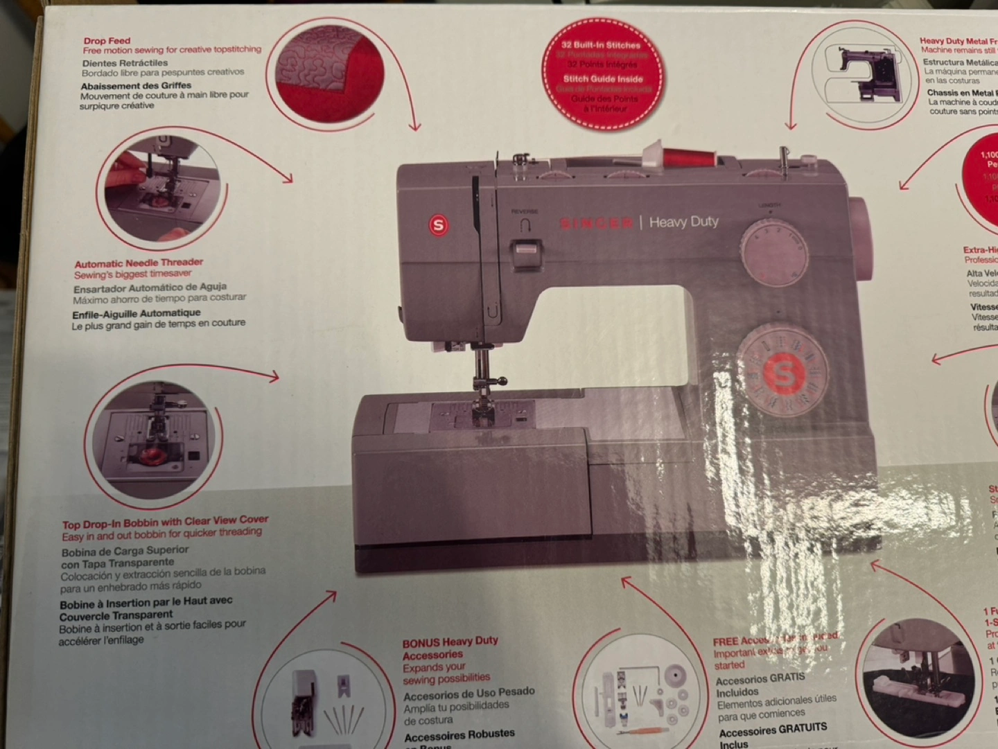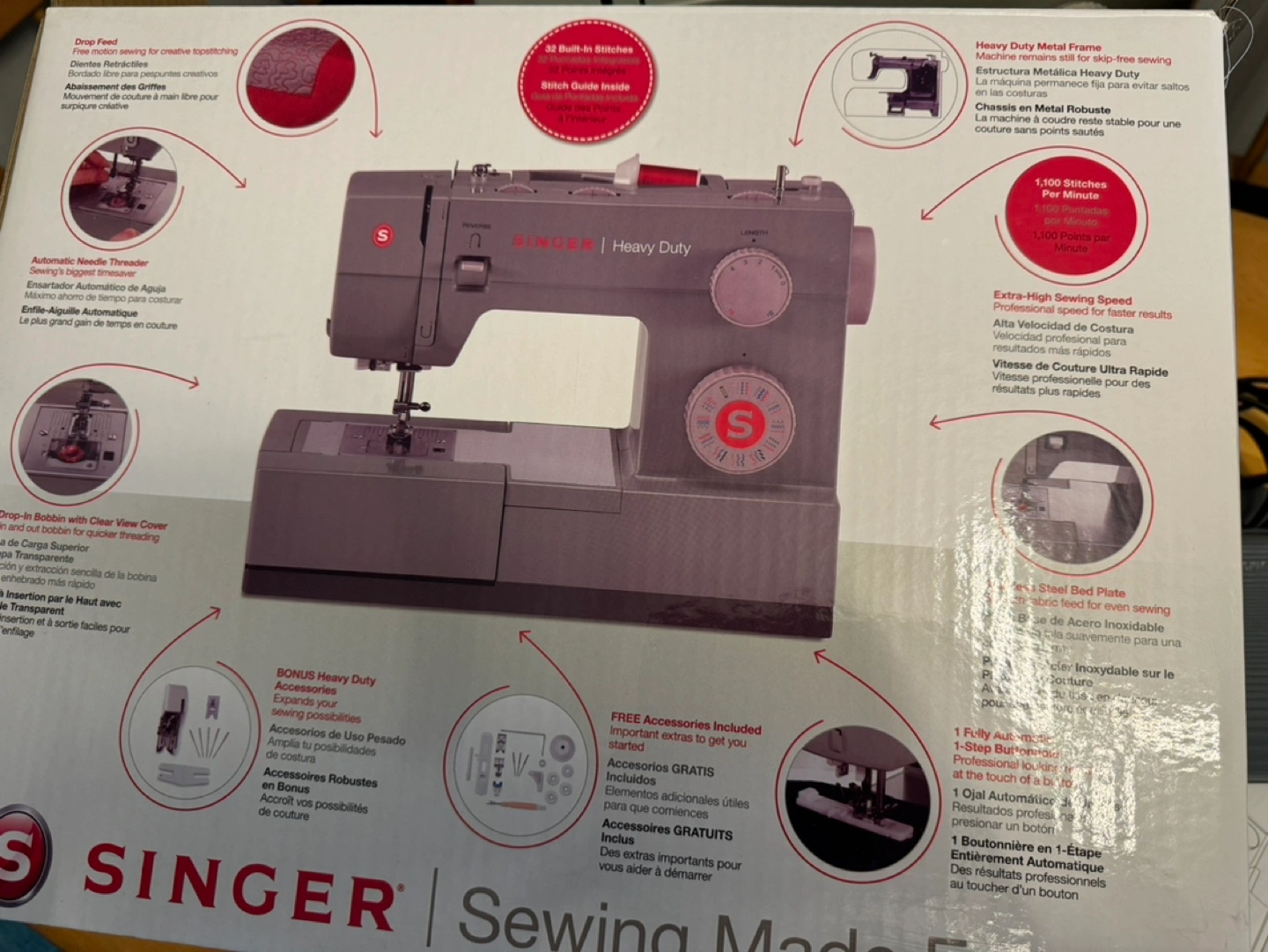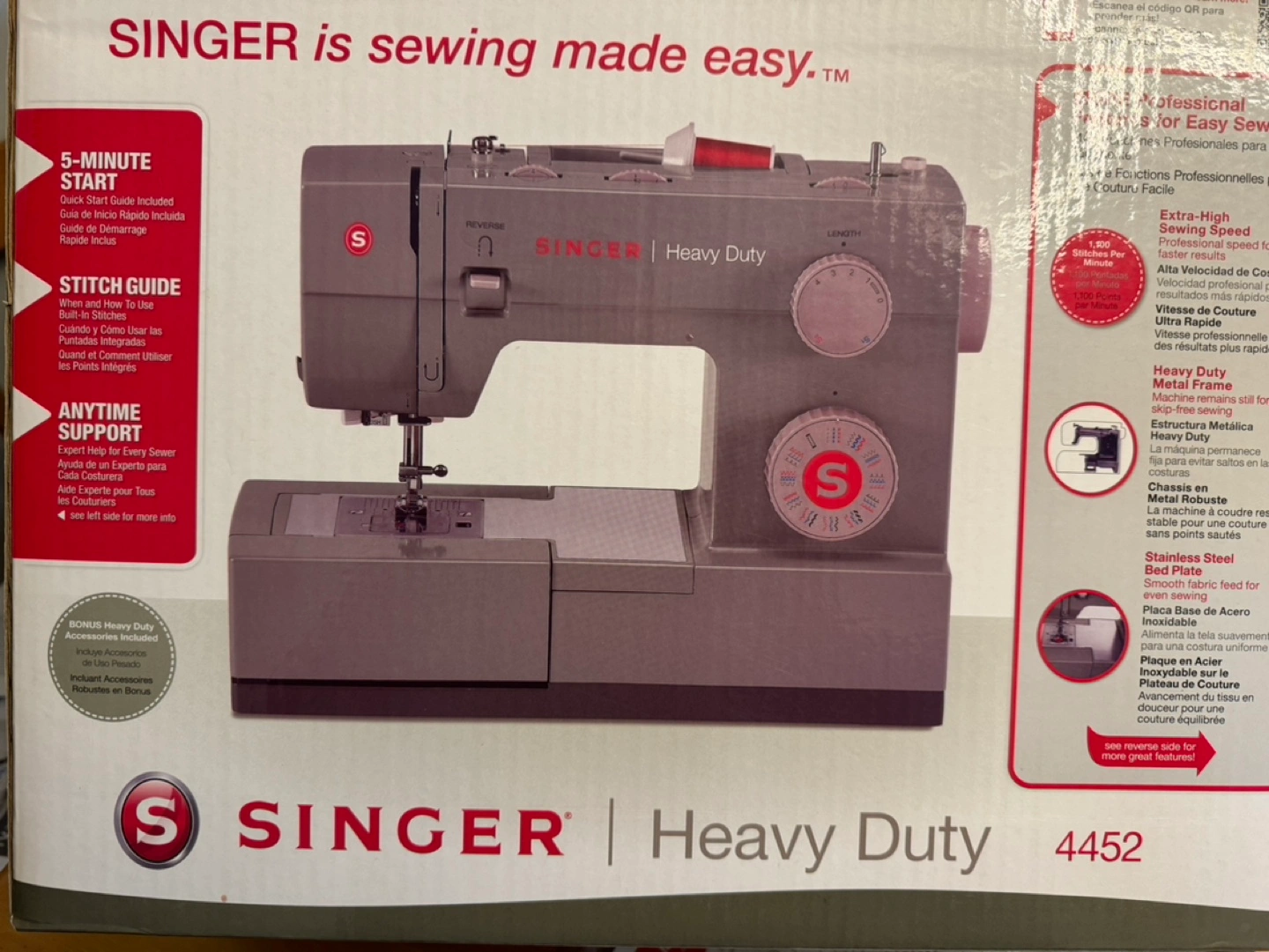 Singer Heavy Duty Sewing Machine. Includes foot pedal, power cord, instruction manual, and several accessories.