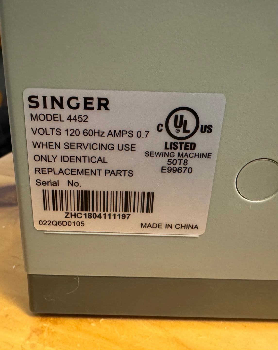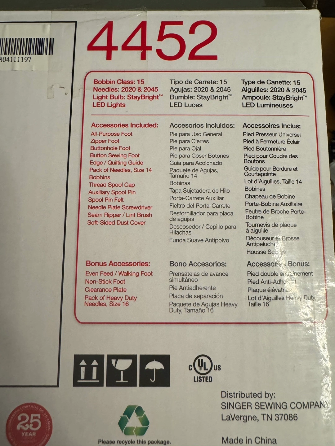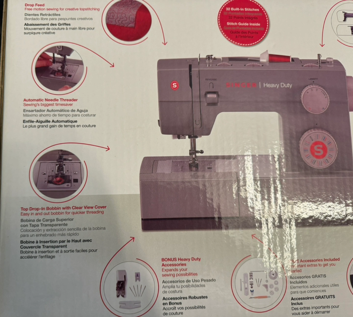 Singer Heavy Duty Sewing Machine. Includes foot pedal, power cord, instruction manual, and several accessories.