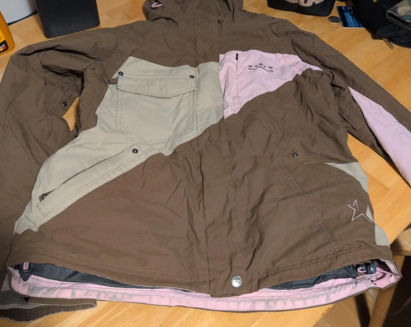 This is a Westbeach ski jacket with a brown, tan, and pink colour blocking design. It has multiple pockets and appears to be made of a durable, water-resistant material. This jacket would be great for hitting the slopes!