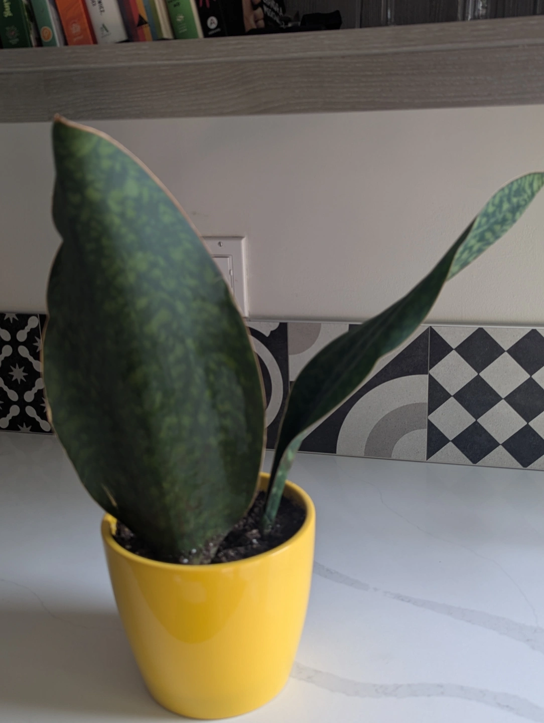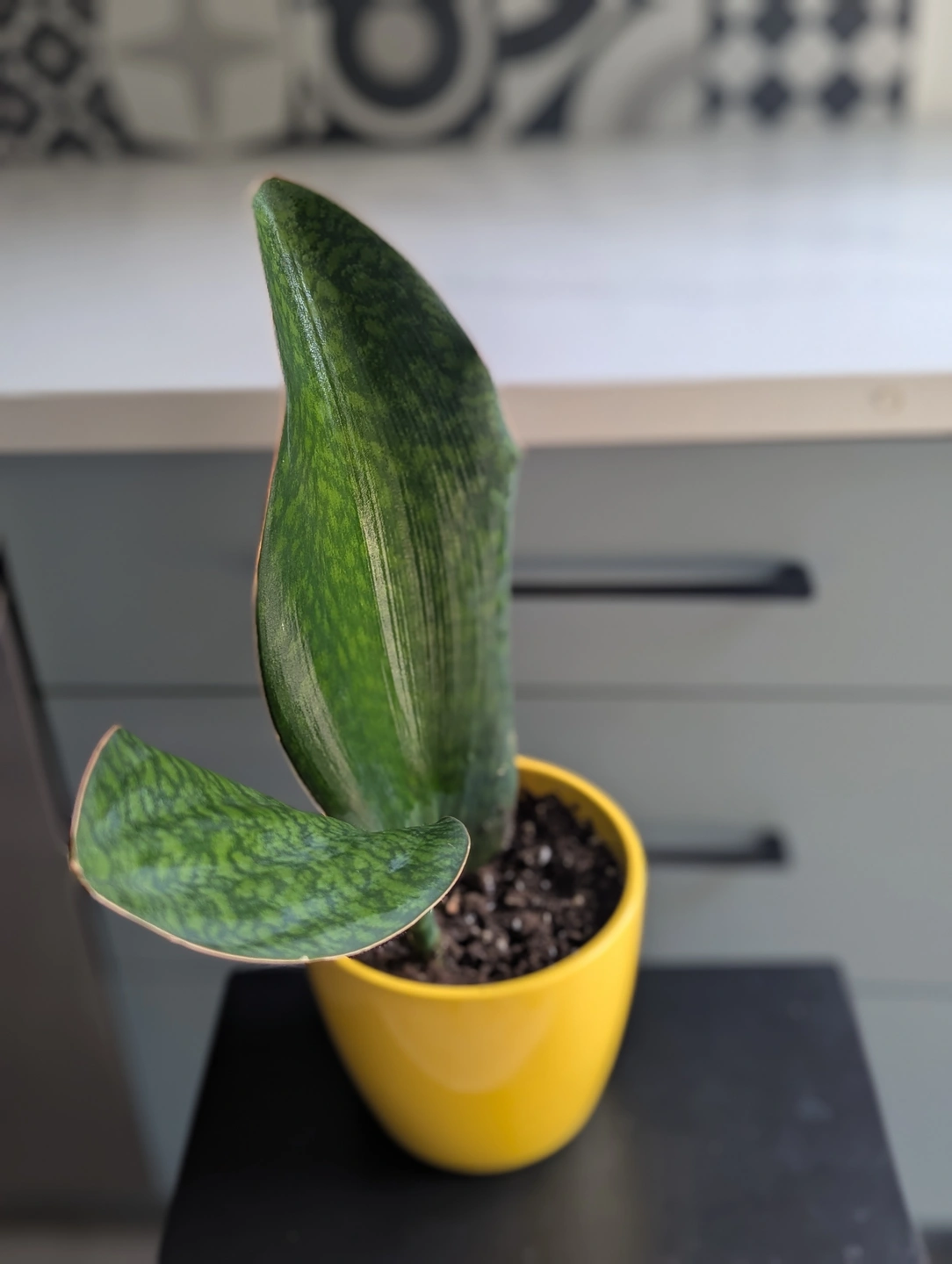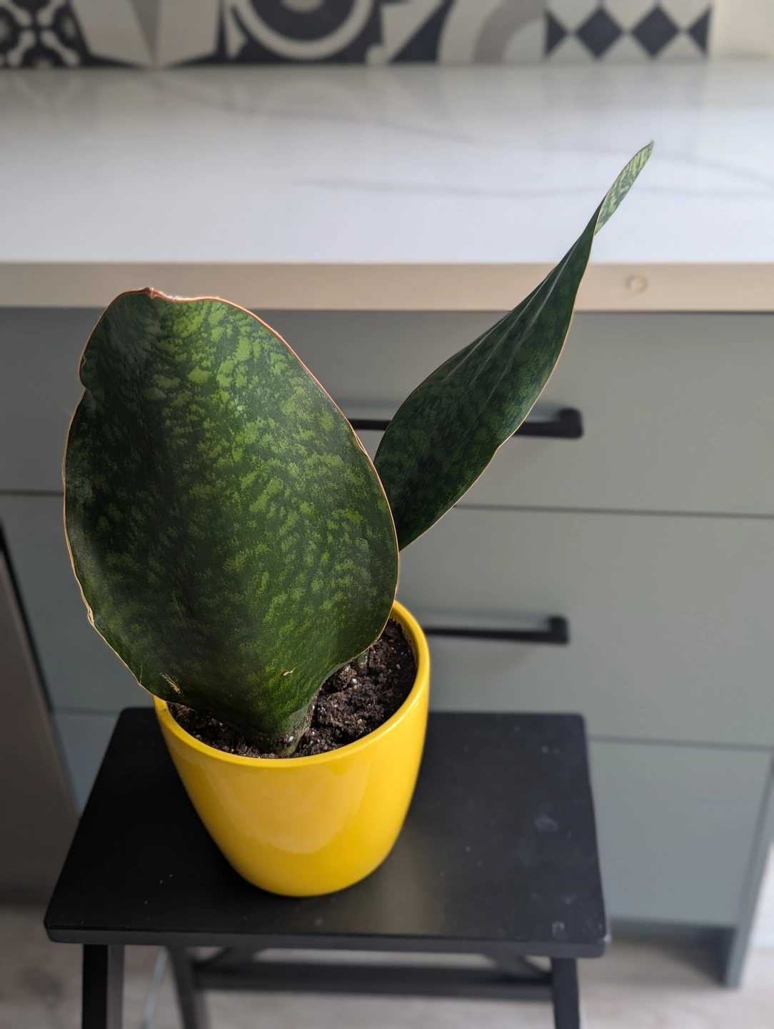 Selling a beautiful and healthy Sansevieria Masoniana, also known as 'Whale Fin' snake plant. This plant is a unique and sought-after variety with its large, paddle-shaped leaves. It's a very low-maintenance plant, perfect for beginners or anyone looking for an easy-care houseplant. The plant comes in a bright yellow ceramic pot, as pictured.
