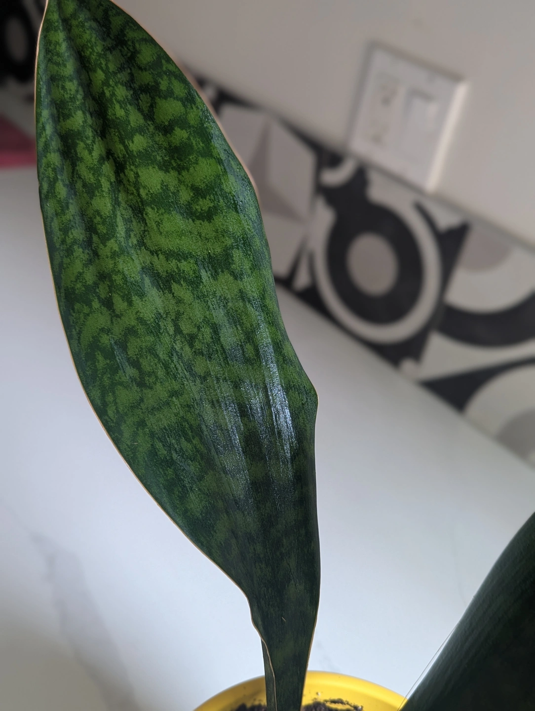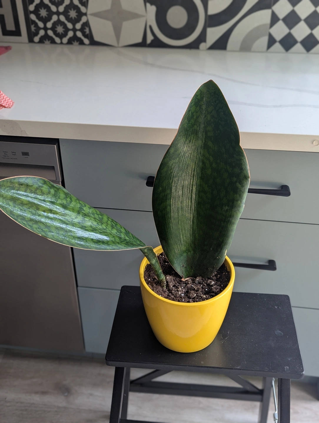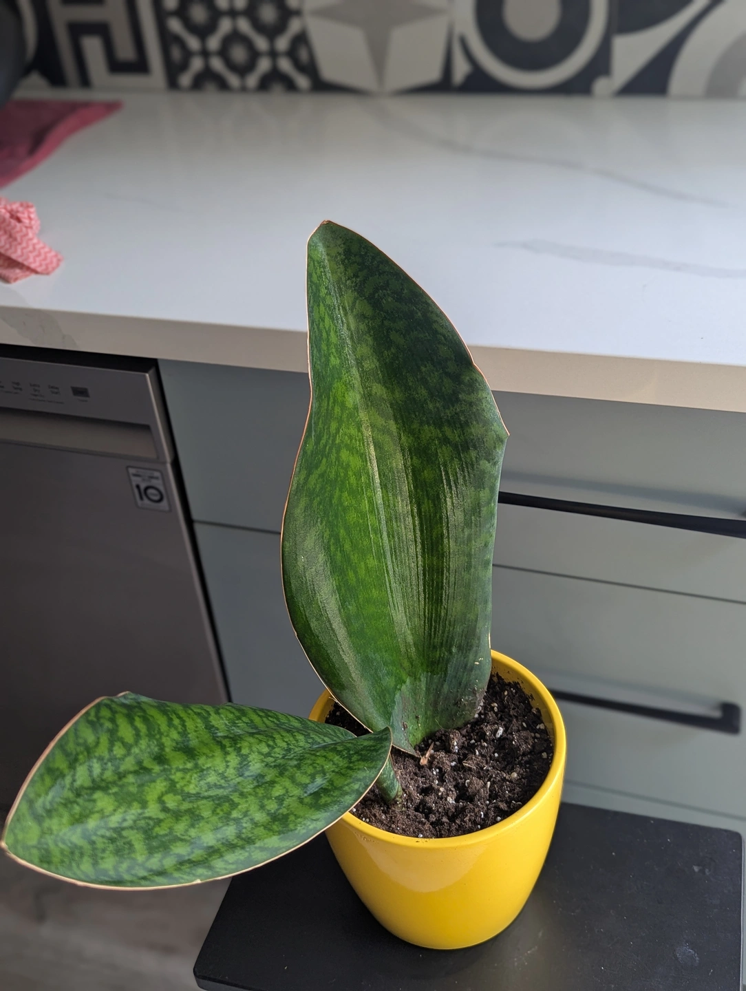 Selling a beautiful and healthy Sansevieria Masoniana, also known as 'Whale Fin' snake plant. This plant is a unique and sought-after variety with its large, paddle-shaped leaves. It's a very low-maintenance plant, perfect for beginners or anyone looking for an easy-care houseplant. The plant comes in a bright yellow ceramic pot, as pictured.