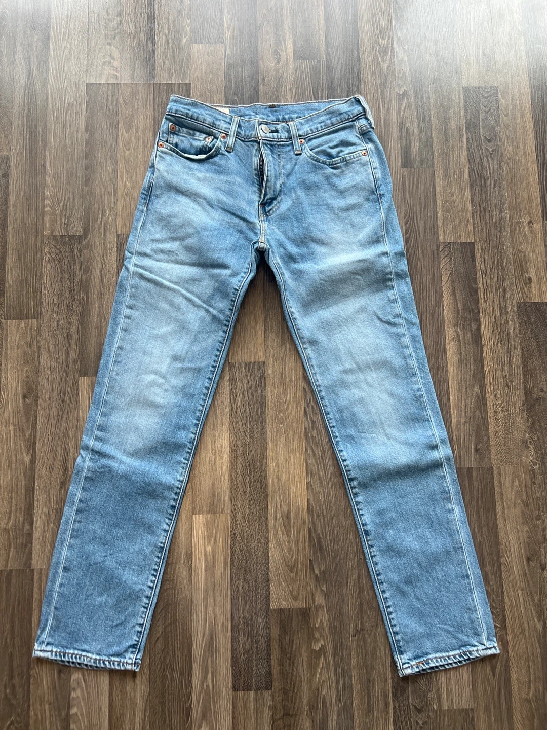 Classic blue denim jeans. Features a button fly closure and five-pocket styling. Made with durable denim. A versatile wardrobe staple.