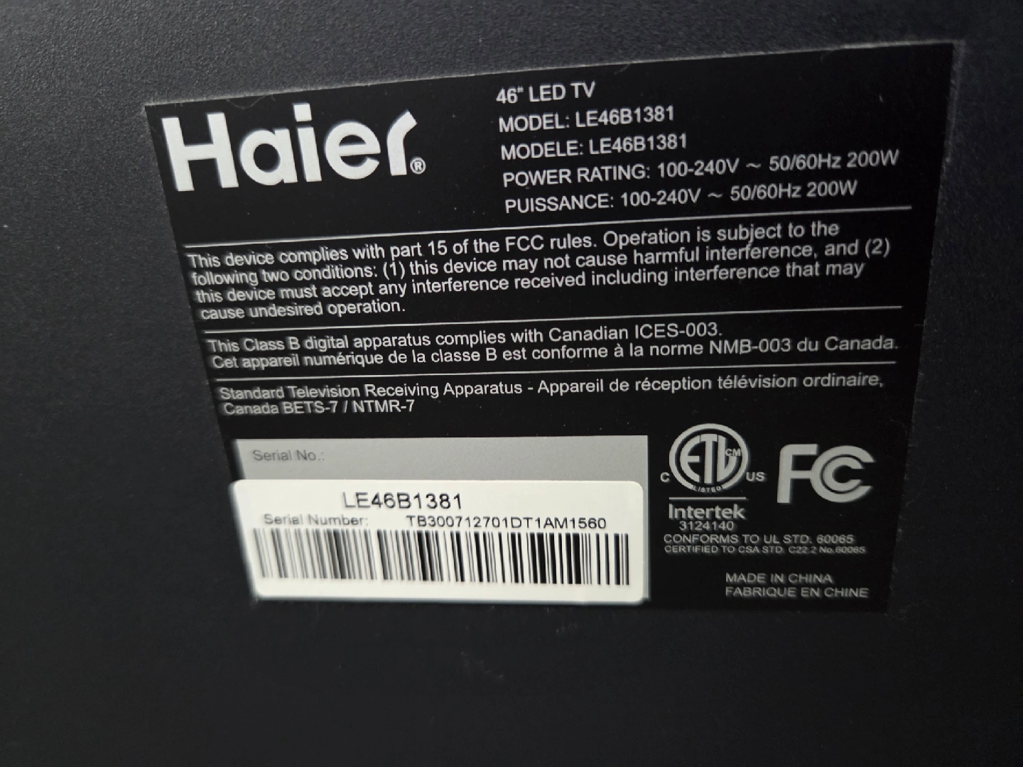 Selling a Haier 46" LED TV. It's in good working condition and comes with a Google Chromecast. Can do 100 if it's just the TV without Chromecast. No remote.