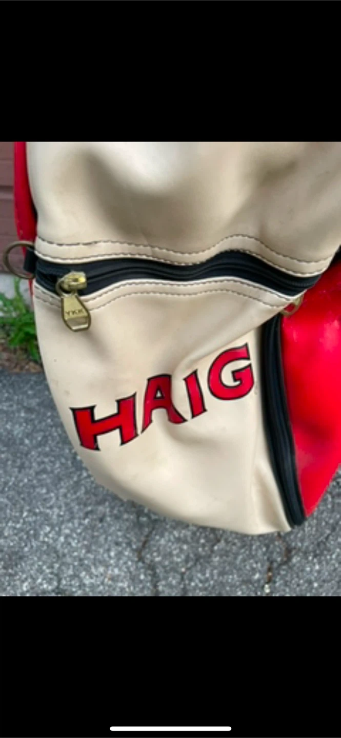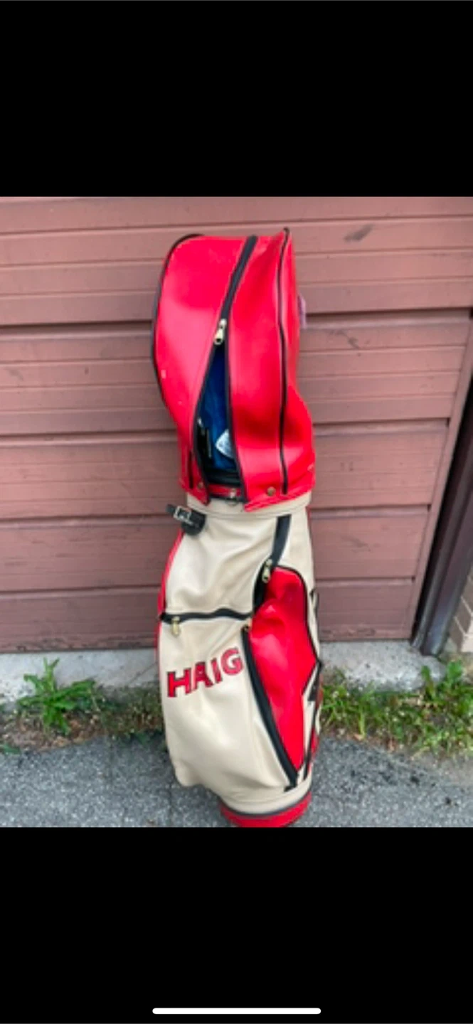 Selling a Haig golf bag in a striking red and beige colour scheme! It's in good condition and ready for the golf course. Perfect for carrying your clubs and accessories during your next round of golf All sales are final.
