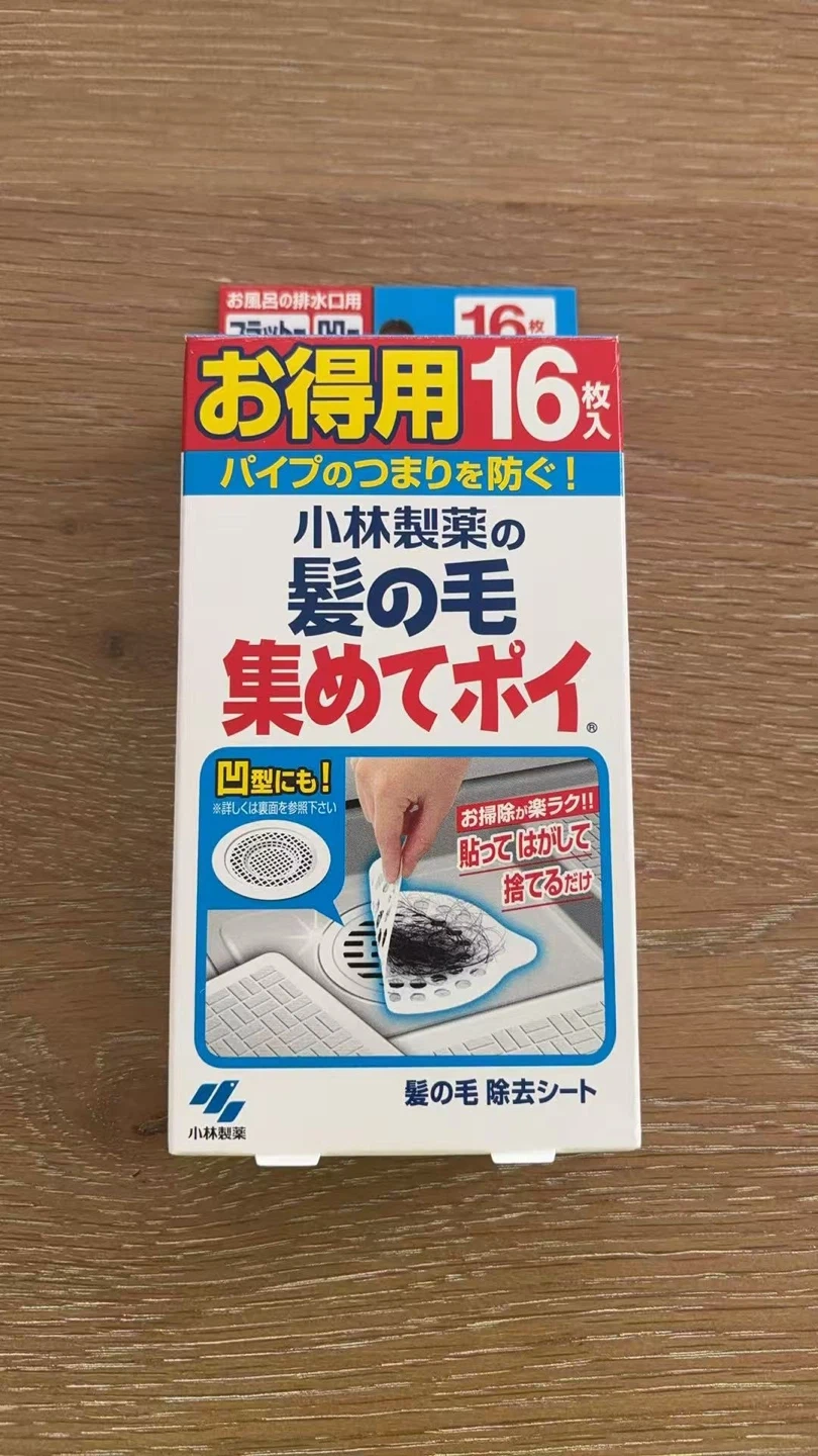 73Selling a pack of Kobayashi Pharmaceutical hair catcher sheets for bathroom drains. These help prevent clogged pipes by catching hair. The pack contains 16 sheets and is designed to be easily applied and removed for convenient cleaning